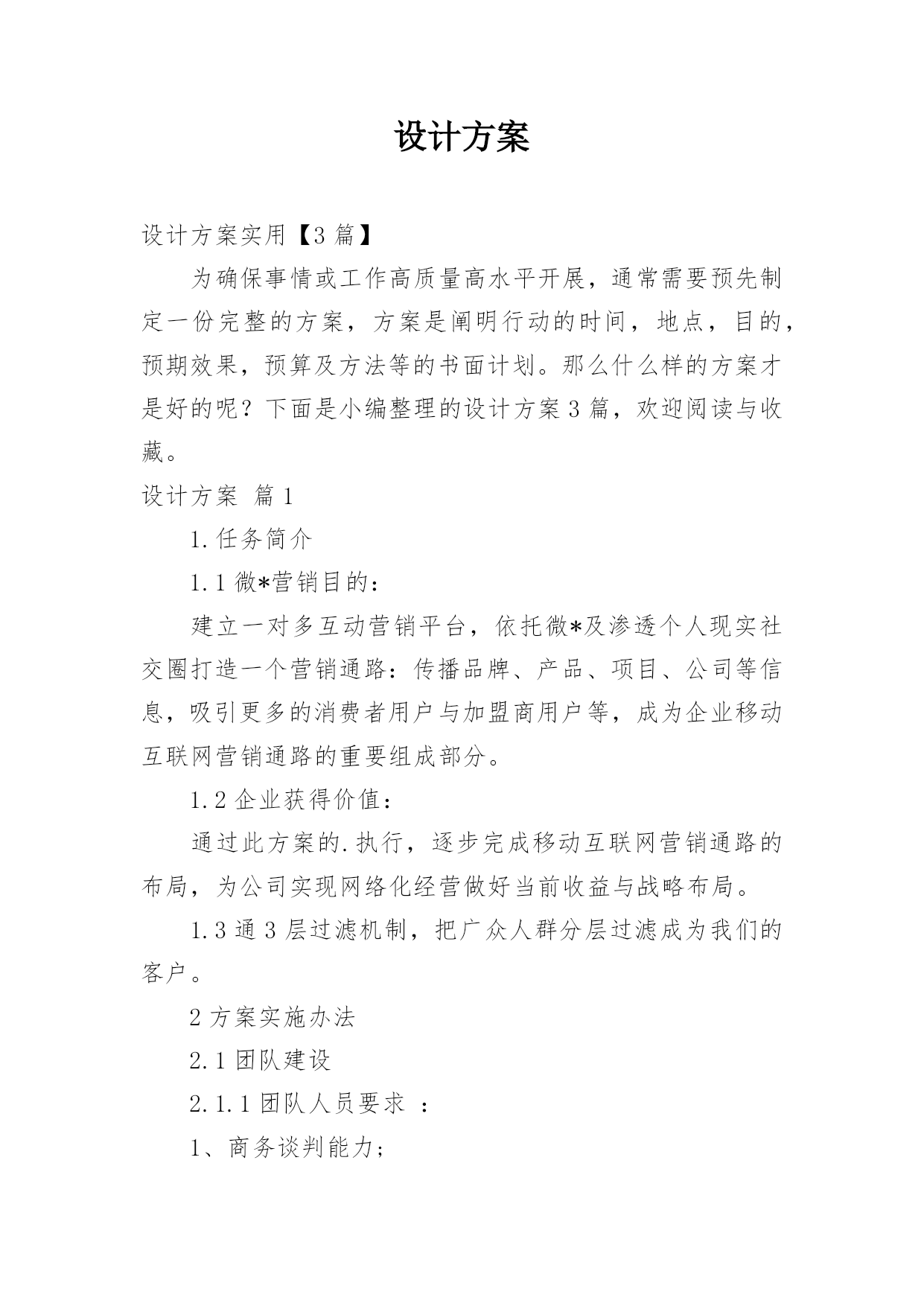 设计方案设计方案实用【3篇】为确保事情或工作高质量高水平开展,通常需要预先制定一份完整的方案,方案是阐明行动的时间,地点,目的,预期效果,预算及方法等的书面计划。那么什么样的方案才是好的呢?下面是小编整理的设计方案3篇,欢迎阅读与收藏。设计方案篇11.任务简介1.1微*营销目的:建立一对多互动营销平台,依托微*及渗透个人现实社交圈打造一个营销通路:传播品牌、产品、项目、公司等信息,吸引更多的消费者用户与加盟商用户等,成为企业移动互联网营销通路的重要组成部分。1.2企业获得价值:通过此方案的.执行,逐步完成