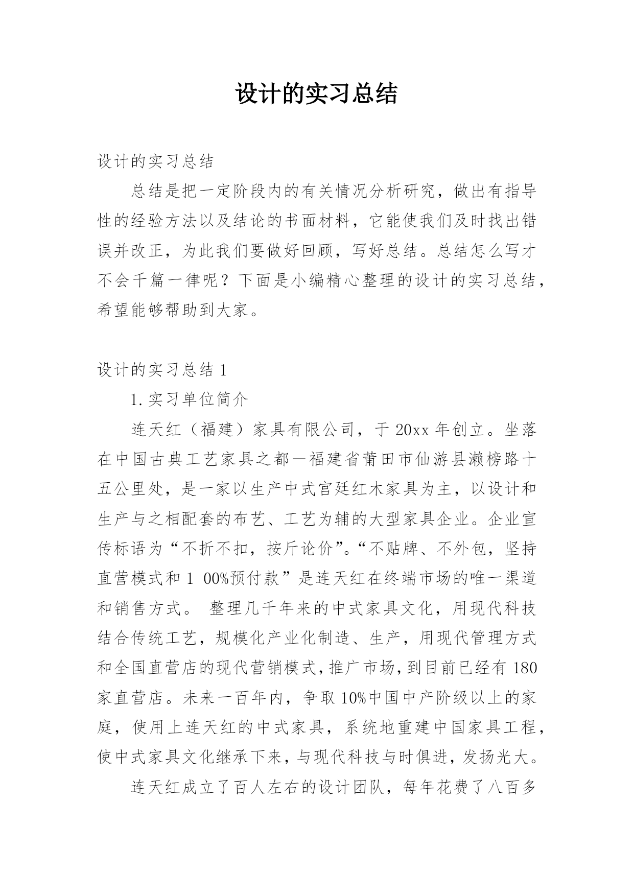 设计的实习总结设计的实习总结总结是把一定阶段内的有关情况分析研究,做出有指导性的经验方法以及结论的书面材料,它能使我们及时找出错误并改正,为此我们要做好回顾,写好总结。总结怎么写才不会千篇一律呢?下面是小编精心整理的设计的实习总结,希望能够帮助到大家。设计的实习总结11.实习单位简介连天红(福建)家具有限公司,于20xx年创立。坐落在中国古典工艺家具之都-福建省莆田市仙游县濑榜路十五公里处,是一家以生产中式宫廷红木家具为主,以设计和生产与之相配套的布艺、工艺为辅的大型家具企业。企业宣传标语为“不折不扣,按