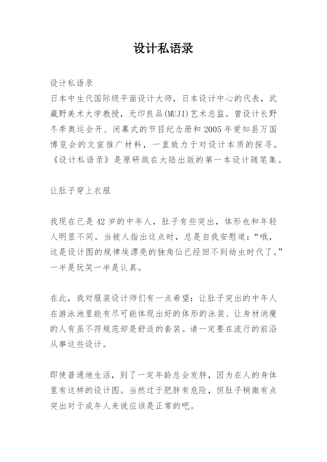 设计私语录设计私语录日本中生代国际级平面设计大师,日本设计中心的代表,武藏野美术大学教授,无印良品(MUJI)艺术总监。曾设计长野冬季奥运会开、闭幕式的节目纪念册和2005年爱知县万国博览会的文宣推广材料,一直致力于对设计本质的探寻。《设计私语录》是原研哉在大陆出版的第一本设计随笔集。让肚子穿上衣服我现在已是42岁的中年人,肚子有些突出,体形也和年轻人明显不同。当被人指出这点时,总是自我安慰道:“哦,这是设计图的规律埃漂亮的独角仙已经回不到幼虫时代了。”一半是玩笑一半是认真。在此,我对服装设计师们有一点希