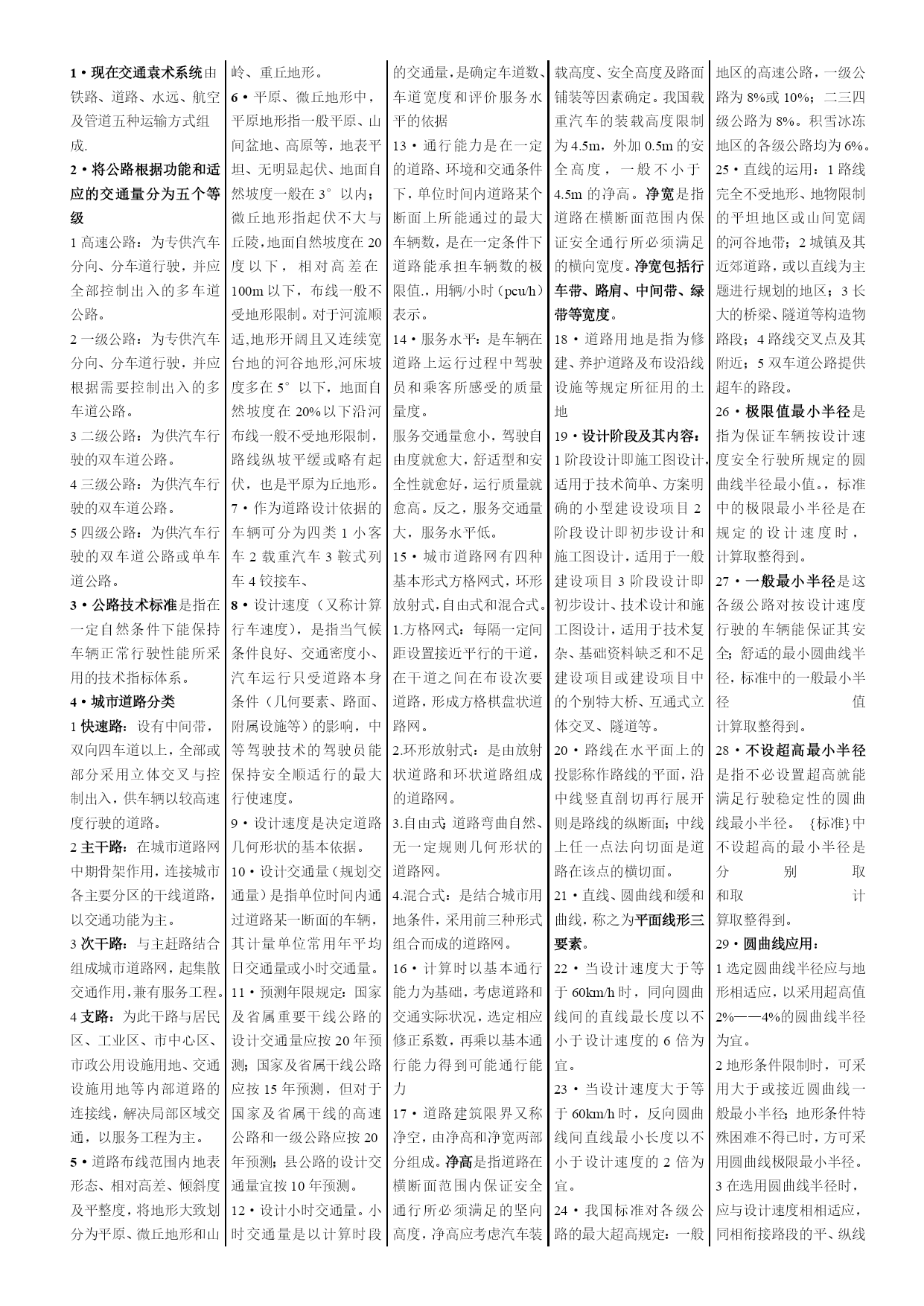 1·现在交通袁术系统由铁路、道路、水远、航空及管道五种运输方式组成.2·将公路根据功能和适应的交通量分为五个等级1高速公路:为专供汽车分向、分车道行驶,并应全部控制出入的多车道公路。2一级公路:为专供汽车分向、分车道行驶,并应根据需要控制出入的多车道公路。3二级公路:为供汽车行驶的双车道公路。4三级公路:为供汽车行驶的双车道公路。5四级公路:为供汽车行驶的双车道公路或单车道公路。3·公路技术标准是指在一定自然条件下能保持车辆正常行驶性能所采用的技术指标体系。4·城市道路分类1快速路:设有中间带,双向四车道
