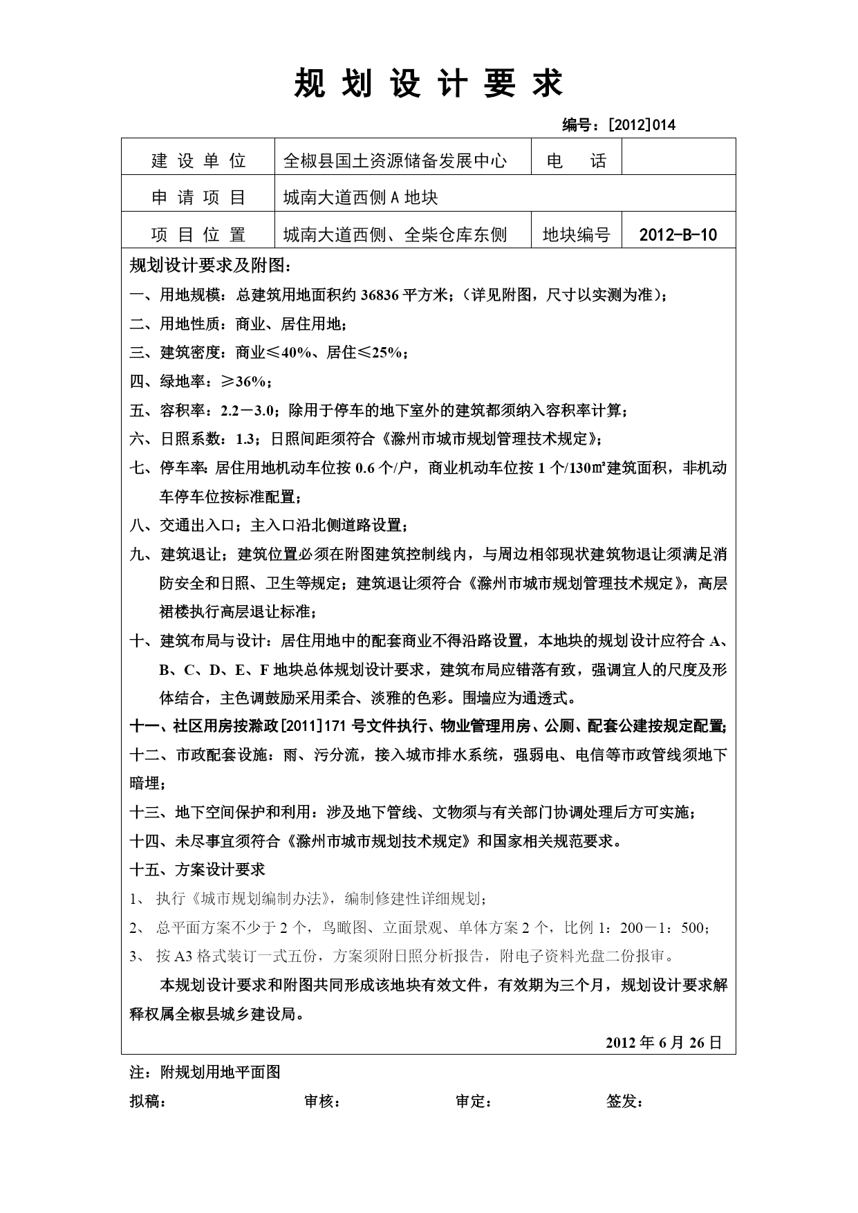 规划设计要求编号:[2012]014建设单位全椒县国土资源储备发展中心电话申请项目城南大道西侧A地块项目位置城南大道西侧、全柴仓库东侧地块编号2012-B-10规划设计要求及附图:一、用地规模:总建筑用地面积约36836平方米;(详见附图,尺寸以实测为准);二、用地性质:商业、居住用地;三、建筑密度:商业≤40%、居住≤25%;四、绿地率:≥36%;五、容积率:2.2-3.0;除用于停车的地下室外的建筑都须纳入容积率计算;六、日照系数:1.3;日照间距须符合《滁州市城市规划管理技术规定》;七、停车率:居住