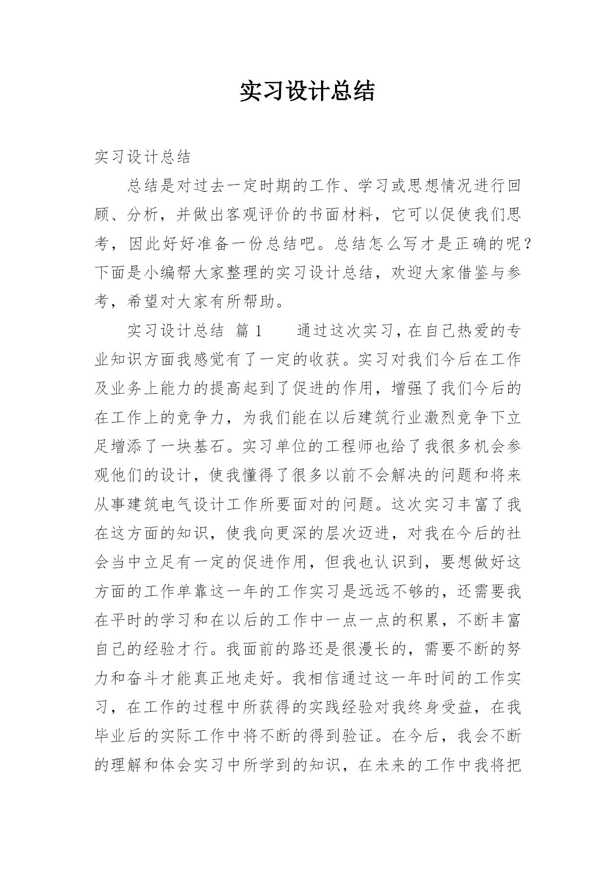 实习设计总结实习设计总结总结是对过去一定时期的工作、学习或思想情况进行回顾、分析,并做出客观评价的书面材料,它可以促使我们思考,因此好好准备一份总结吧。总结怎么写才是正确的呢?下面是小编帮大家整理的实习设计总结,欢迎大家借鉴与参考,希望对大家有所帮助。实习设计总结篇1通过这次实习,在自己热爱的专业知识方面我感觉有了一定的收获。实习对我们今后在工作及业务上能力的提高起到了促进的作用,增强了我们今后的在工作上的竞争力,为我们能在以后建筑行业激烈竞争下立足增添了一块基石。实习单位的工程师也给了我很多机会参观他们