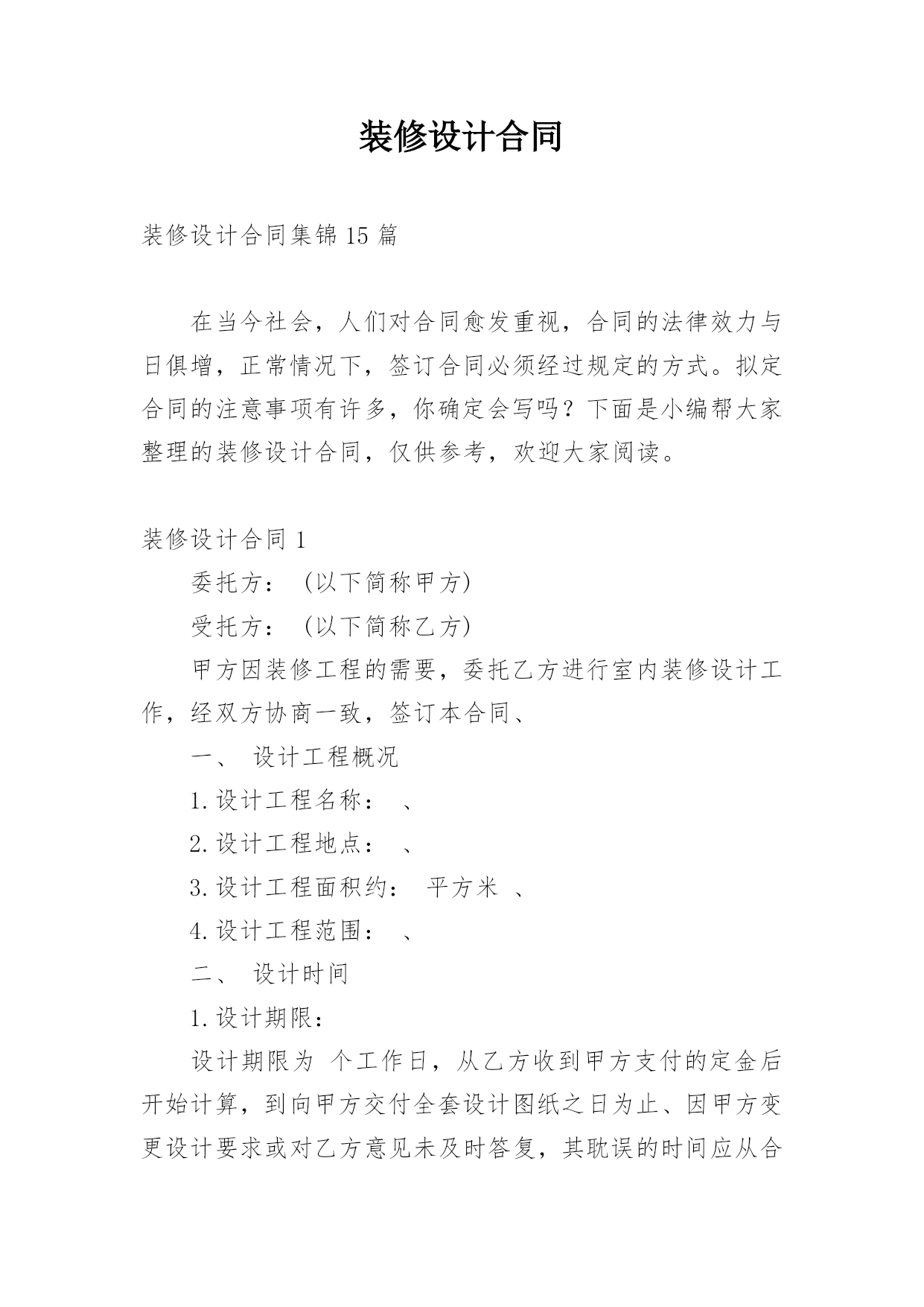 装修设计合同装修设计合同集锦15篇在当今社会,人们对合同愈发重视,合同的法律效力与日俱增,正常情况下,签订合同必须经过规定的方式。拟定合同的注意事项有许多,你确定会写吗?下面是小编帮大家整理的装修设计合同,仅供参考,欢迎大家阅读。装修设计合同1委托方:(以下简称甲方)受托方:(以下简称乙方)甲方因装修工程的需要,委托乙方进行室内装修设计工作,经双方协商一致,签订本合同、一、设计工程概况1.设计工程名称:、2.设计工程地点:、3.设计工程面积约:平方米、4.设计工程范围:、二、设计时间1.设计期限:设计期限