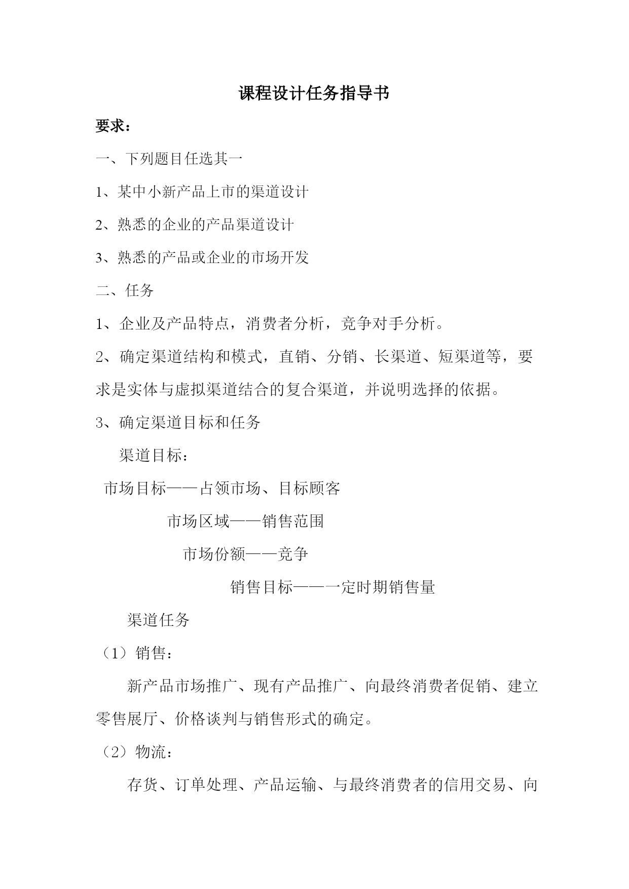 课程设计任务指导书要求:一、下列题目任选其一1、某中小新产品上市的渠道设计2、熟悉的企业的产品渠道设计3、熟悉的产品或企业的市场开发二、任务1、企业及产品特点,消费者分析,竞争对手分析。2、确定渠道结构和模式,直销、分销、长渠道、短渠道等,要求是实体与虚拟渠道结合的复合渠道,并说明选择的依据。3、确定渠道目标和任务渠道目标:市场目标——占领市场、目标顾客市场区域——销售范围市场份额——竞争销售目标——一定时期销售量渠道任务(1)销售:新产品市场推广、现有产品推广、向最终消费者促销、建立零售展厅、价格谈判与
