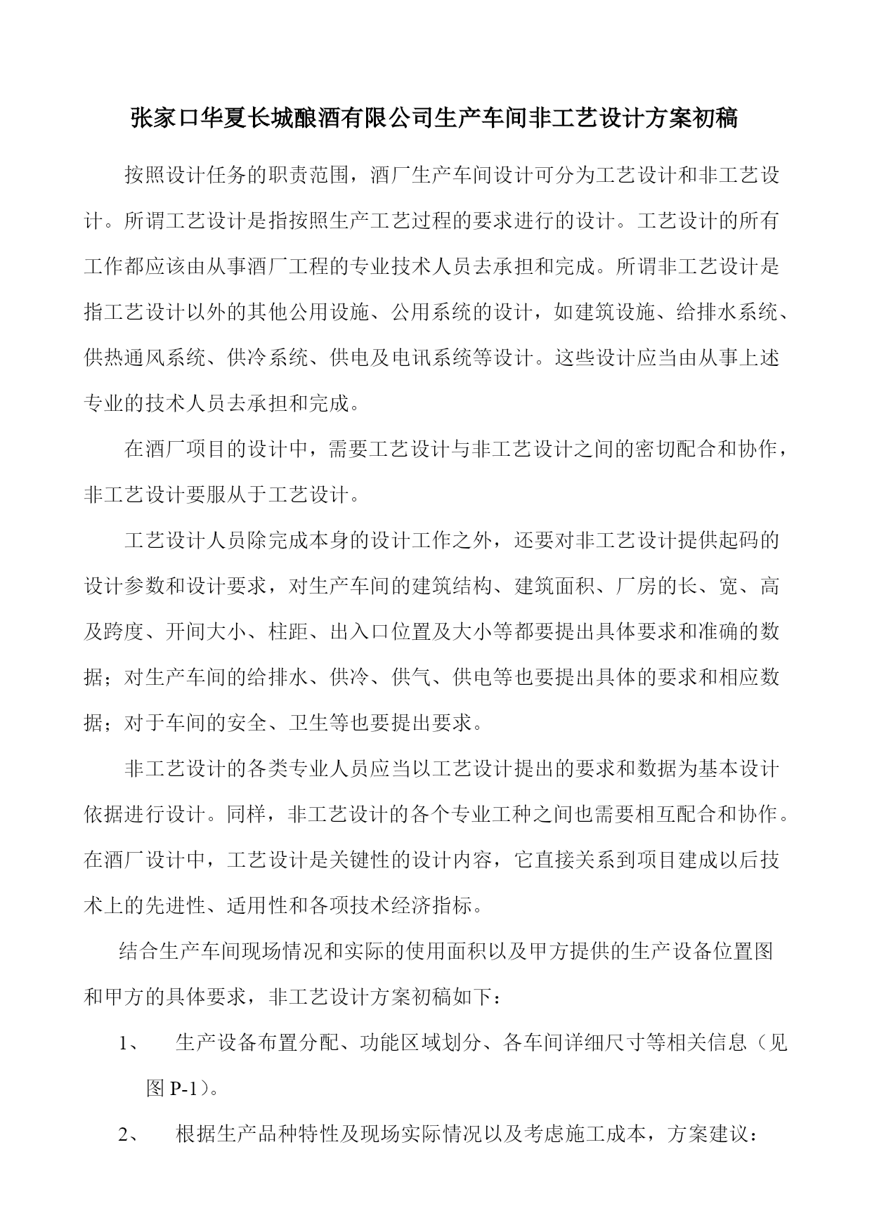 张家口华夏长城酿酒有限公司生产车间非工艺设计方案初稿按照设计任务的职责范围,酒厂生产车间设计可分为工艺设计和非工艺设计。所谓工艺设计是指按照生产工艺过程的要求进行的设计。工艺设计的所有工作都应该由从事酒厂工程的专业技术人员去承担和完成。所谓非工艺设计是指工艺设计以外的其他公用设施、公用系统的设计,如建筑设施、给排水系统、供热通风系统、供冷系统、供电及电讯系统等设计。这些设计应当由从事上述专业的技术人员去承担和完成。在酒厂项目的设计中,需要工艺设计与非工艺设计之间的密切配合和协作,非工艺设计要服从于工艺设计