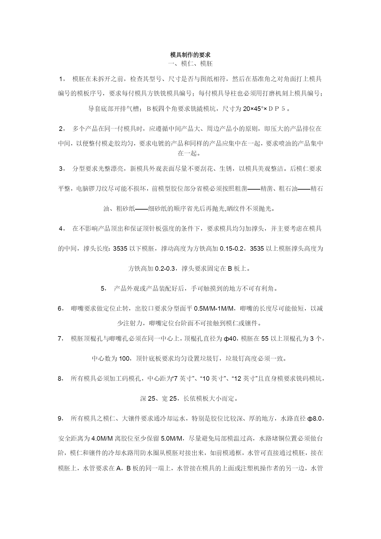 模具制作的要求一、模仁、模胚1,模胚在未拆开之前,检查其型号、尺寸是否与图纸相符,然后在基准角之对角面打上模具编号的模板序号,要求每付模具方铁铣模具编号;每付模具导柱也必须用打磨机刻上模具编号;导套底部开排气槽;B板四个角要求铣撬模坑,尺寸为20×45°×DP5。2,多个产品在同一付模具时,应遵循中间产品大、周边产品小的原则,即压大的产品排位在中间,以便整付模走胶均匀,要求电镀的产品和同样的产品应集中在一起,要求喷油的产品集中在一起。3,分型要求光整漂亮,新模具外观表面尽量不要刮花、生锈,以模具美观整洁。