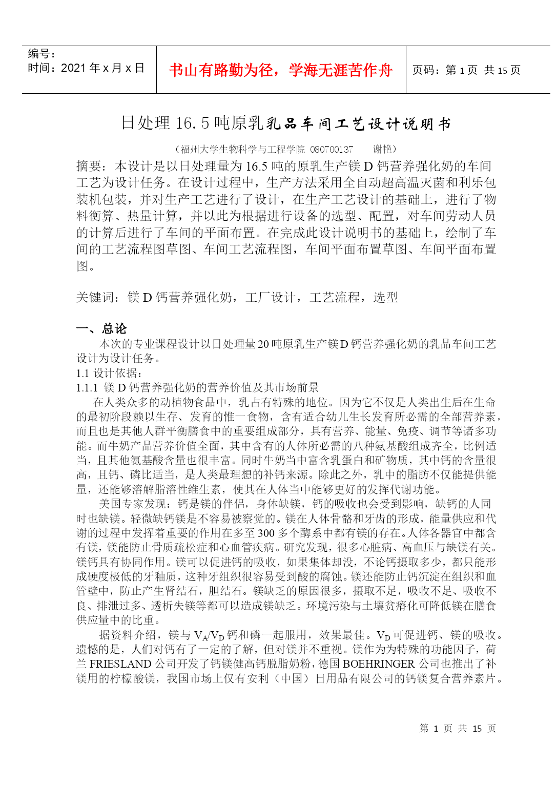 编号:时间:2021年x月x日书山有路勤为径,学海无涯苦作舟页码:第PAGE15页共NUMPAGES15页第PAGE\*MERGEFORMAT15页共NUMPAGES\*MERGEFORMAT15页日处理16.5吨原乳乳品车间工艺设计说明书(福州大学生物科学与工程学院080700137谢艳)摘要:本设计是以日处理量为16.5吨的原乳生产镁D钙营养强化奶的车间工艺为设计任务。在设计过程中,生产方法采用全自动超高温灭菌和利乐包装机包装,并对生产工艺进行了设计,在生产工艺设计的基础上,进