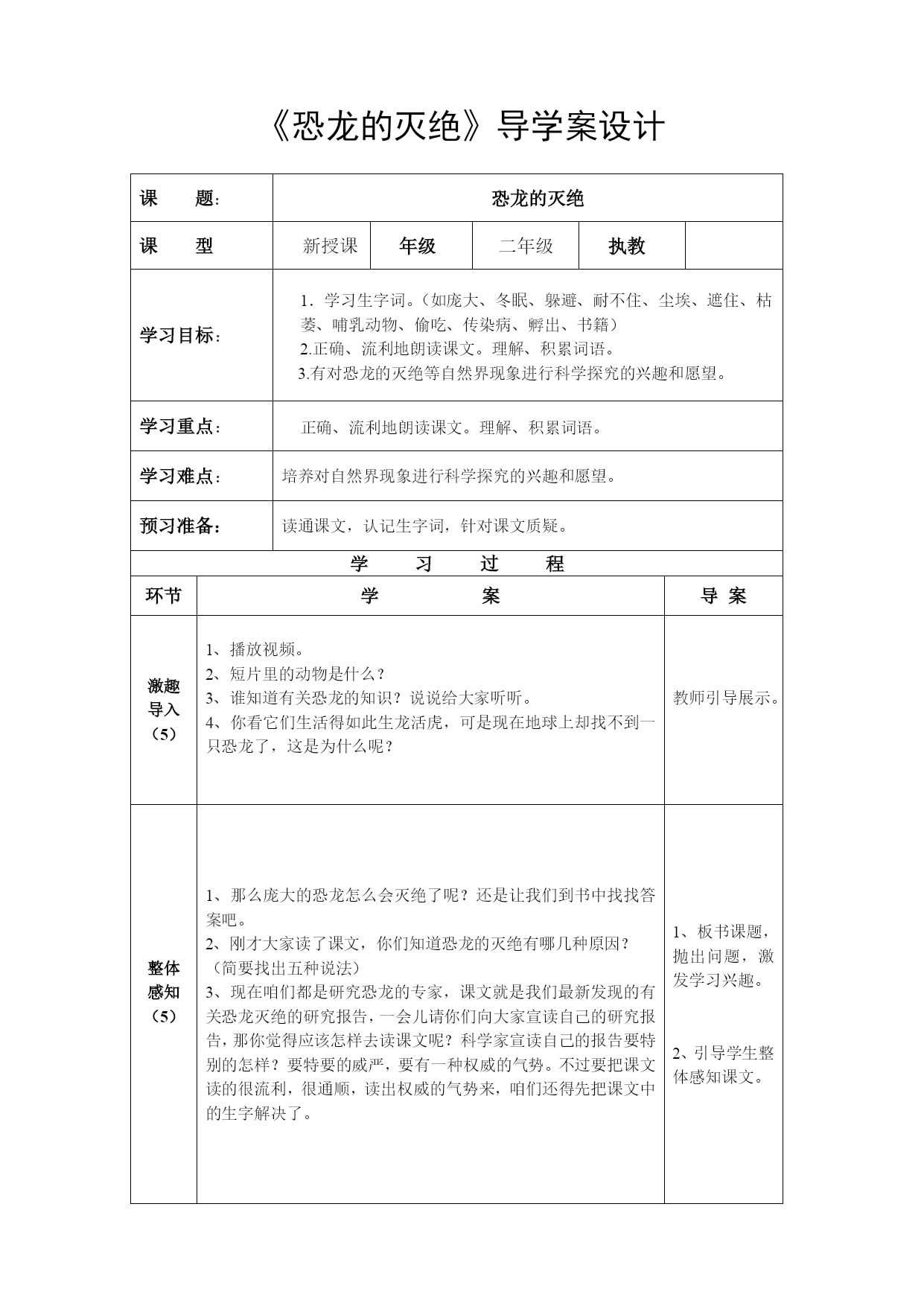 《恐龙的灭绝》导学案设计课题:恐龙的灭绝课型新授课年级二年级执教学习目标:1.学习生字词。(如庞大、冬眠、躲避、耐不住、尘埃、遮住、枯萎、哺乳动物、偷吃、传染病、孵出、书籍)2.正确、流利地朗读课文。理解、积累词语。3.有对恐龙的灭绝等自然界现象进行科学探究的兴趣和愿望。学习重点:正确、流利地朗读课文。理解、积累词语。学习难点:培养对自然界现象进行科学探究的兴趣和愿望。预习准备:读通课文,认记生字词,针对课文质疑。学习过程环节学案导案激趣导入(5)1、播放视频。2、短片里的动物是什么?3、谁知道有关恐龙的