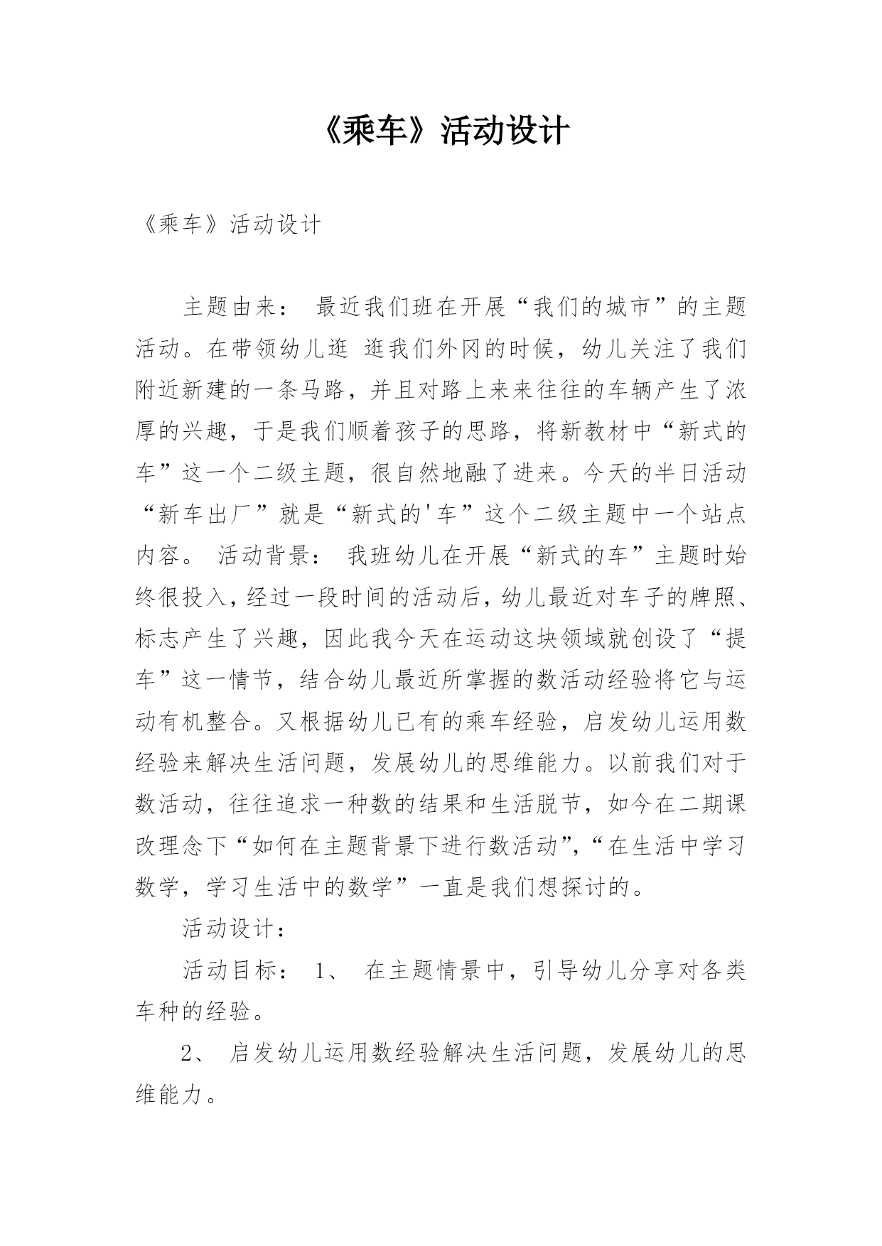 《乘车》活动设计《乘车》活动设计主题由来:最近我们班在开展“我们的城市”的主题活动。在带领幼儿逛逛我们外冈的时候,幼儿关注了我们附近新建的一条马路,并且对路上来来往往的车辆产生了浓厚的兴趣,于是我们顺着孩子的思路,将新教材中“新式的车”这一个二级主题,很自然地融了进来。今天的半日活动“新车出厂”就是“新式的'车”这个二级主题中一个站点内容。活动背景:我班幼儿在开展“新式的车”主题时始终很投入,经过一段时间的活动后,幼儿最近对车子的牌照、标志产生了兴趣,因此我今天在运动这块领域就创设了“提车”这一情节,结合