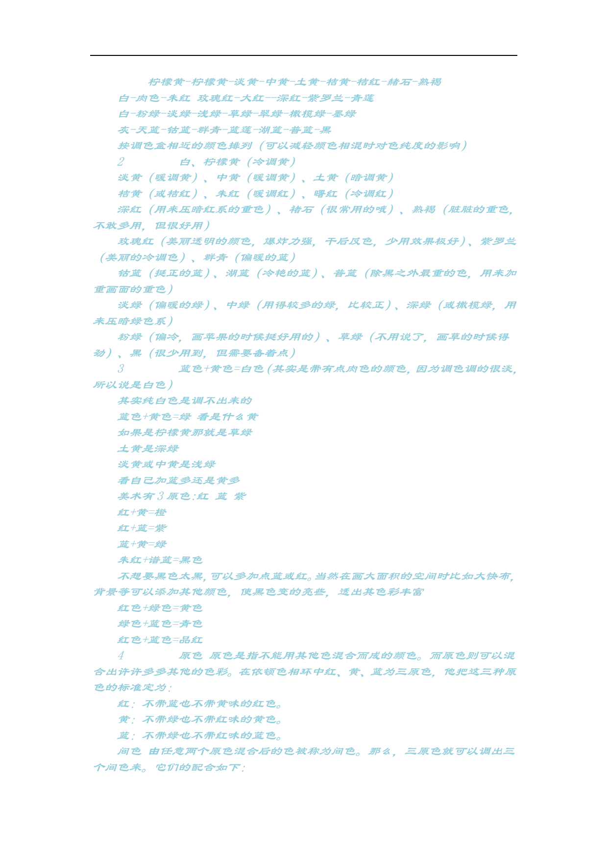 柠檬黄-柠檬黄-淡黄-中黄-土黄-桔黄-桔红-赭石-熟褐白-肉色-朱红玫瑰红-大红--深红-紫罗兰-青莲白-粉绿-淡绿-浅绿-草绿-翠绿-橄榄绿-墨绿灰-天蓝-钴蓝-群青-蓝莲-湖蓝-普蓝-黑按调色盒相近的颜色排列(可以减轻颜色相混时对色纯度的影响)2白、柠檬黄(冷调黄)淡黄(暖调黄)、中黄(暖调黄)、土黄(暗调黄)桔黄(或桔红)、朱红(暖调红)、曙红(冷调红)深红(用来压暗红系的重色)、褚石(很常用的哦)、熟褐(脏脏的重色,不敢多用,但很好用)玫瑰红(美丽透明的颜色,爆炸力强,干后反色,少用效果极好)、
