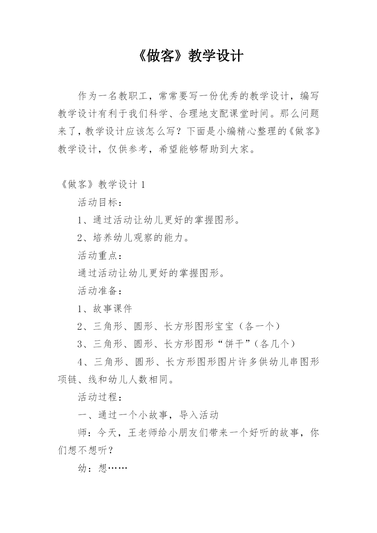 《做客》教学设计作为一名教职工,常常要写一份优秀的教学设计,编写教学设计有利于我们科学、合理地支配课堂时间。那么问题来了,教学设计应该怎么写?下面是小编精心整理的《做客》教学设计,仅供参考,希望能够帮助到大家。《做客》教学设计1活动目标:1、通过活动让幼儿更好的掌握图形。2、培养幼儿观察的能力。活动重点:通过活动让幼儿更好的掌握图形。活动准备:1、故事课件2、三角形、圆形、长方形图形宝宝(各一个)3、三角形、圆形、长方形图形“饼干”(各几个)4、三角形、圆形、长方形图形图片许多供幼儿串图形项链、线和幼儿人