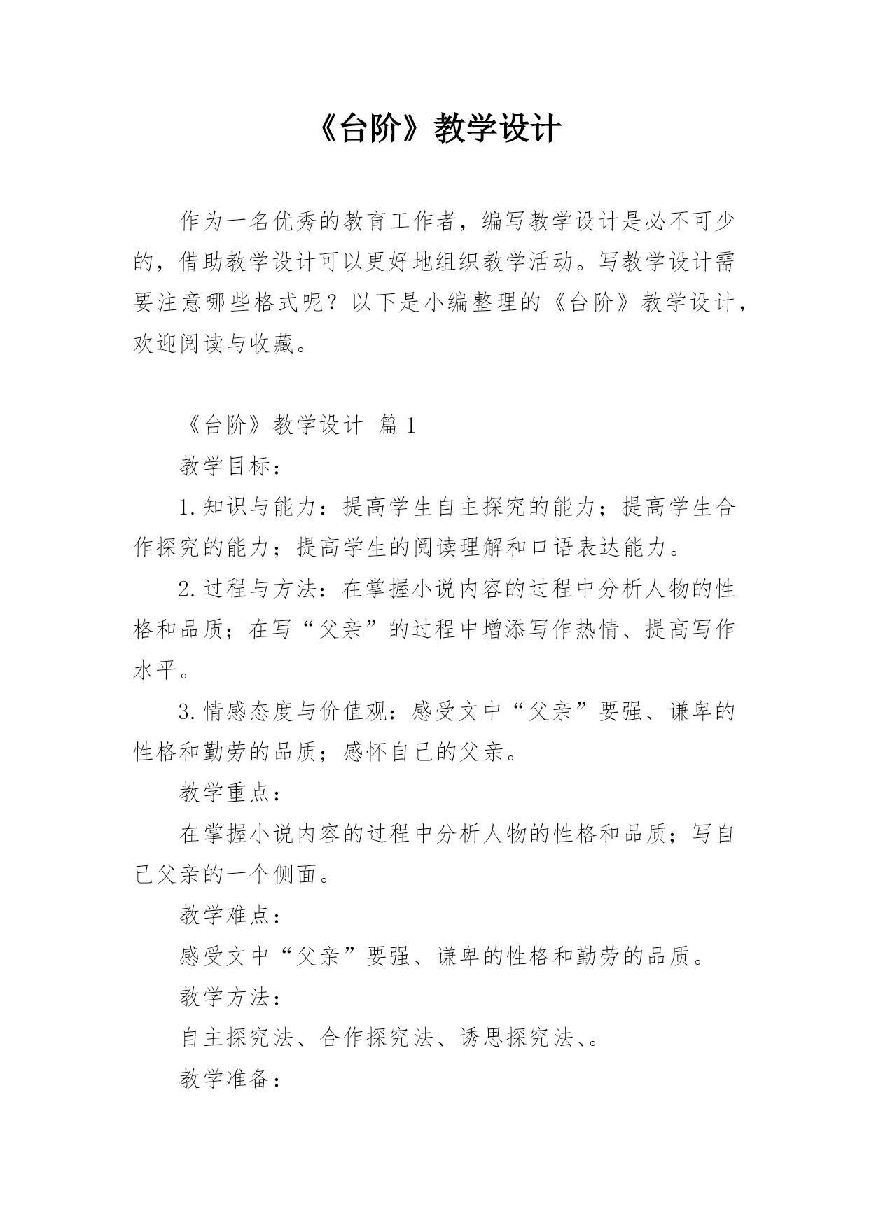 《台阶》教学设计作为一名优秀的教育工作者,编写教学设计是必不可少的,借助教学设计可以更好地组织教学活动。写教学设计需要注意哪些格式呢?以下是小编整理的《台阶》教学设计,欢迎阅读与收藏。《台阶》教学设计篇1教学目标:1.知识与能力:提高学生自主探究的能力;提高学生合作探究的能力;提高学生的阅读理解和口语表达能力。2.过程与方法:在掌握小说内容的过程中分析人物的性格和品质;在写“父亲”的过程中增添写作热情、提高写作水平。3.情感态度与价值观:感受文中“父亲”要强、谦卑的性格和勤劳的品质;感怀自己的父亲。教学重