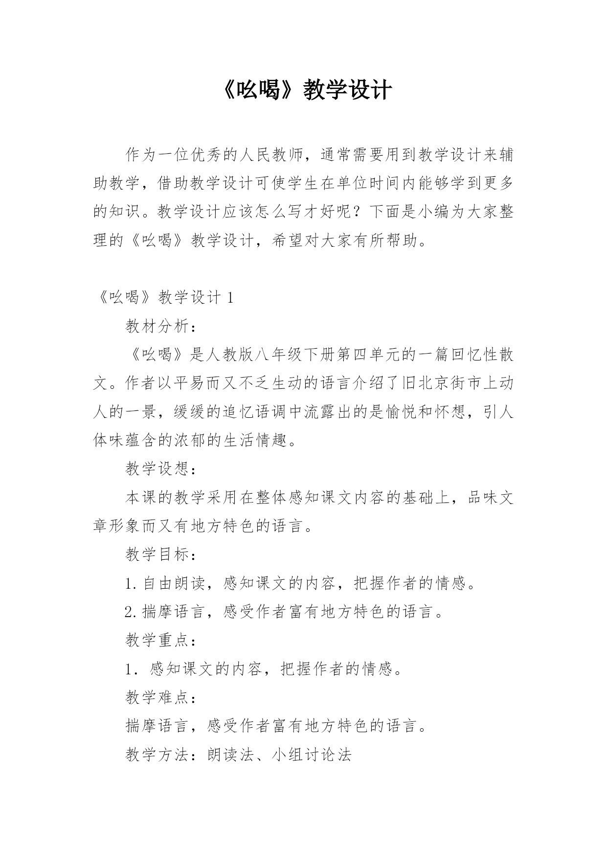 《吆喝》教学设计作为一位优秀的人民教师,通常需要用到教学设计来辅助教学,借助教学设计可使学生在单位时间内能够学到更多的知识。教学设计应该怎么写才好呢?下面是小编为大家整理的《吆喝》教学设计,希望对大家有所帮助。《吆喝》教学设计1教材分析:《吆喝》是人教版八年级下册第四单元的一篇回忆性散文。作者以平易而又不乏生动的语言介绍了旧北京街市上动人的一景,缓缓的追忆语调中流露出的是愉悦和怀想,引人体味蕴含的浓郁的生活情趣。教学设想:本课的教学采用在整体感知课文内容的基础上,品味文章形象而又有地方特色的语言。教学目标