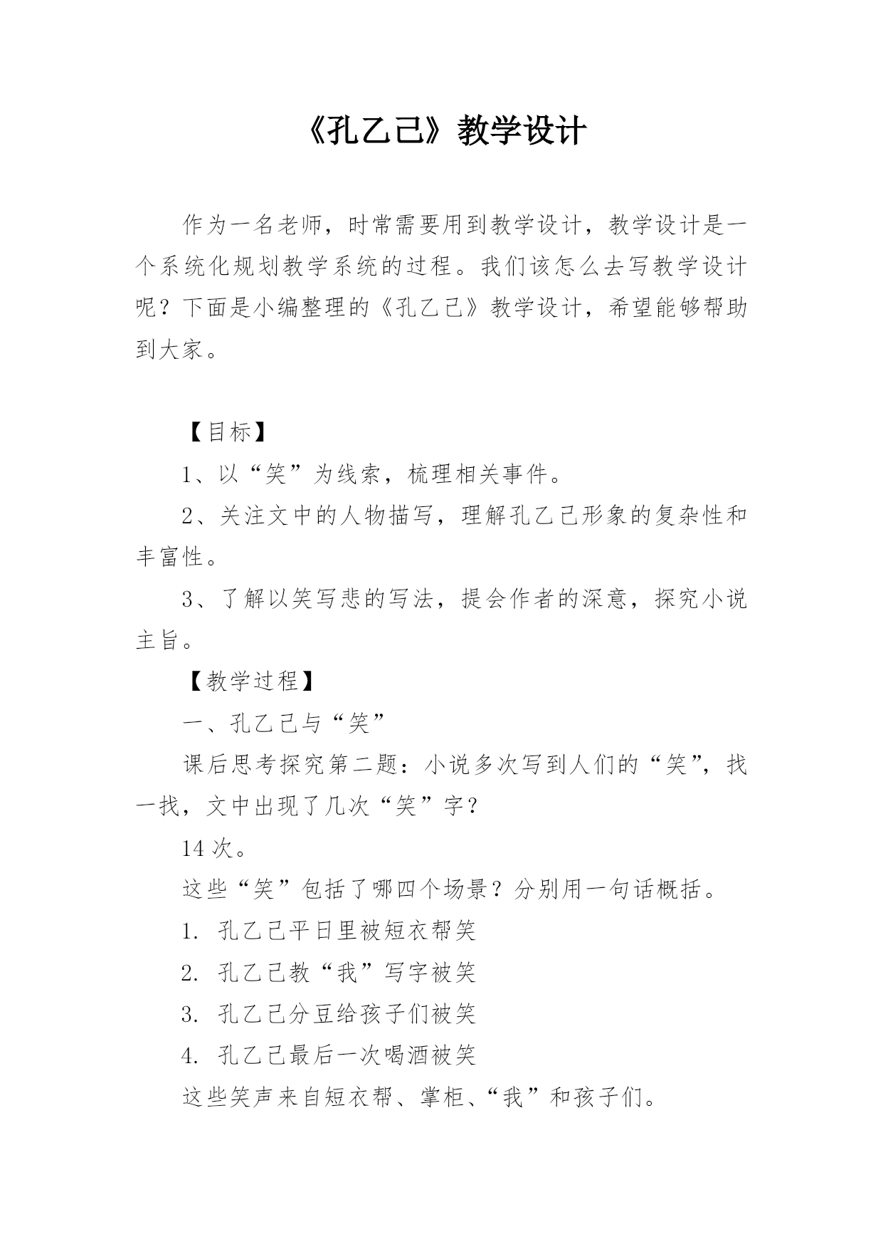《孔乙己》教学设计作为一名老师,时常需要用到教学设计,教学设计是一个系统化规划教学系统的过程。我们该怎么去写教学设计呢?下面是小编整理的《孔乙己》教学设计,希望能够帮助到大家。【目标】1、以“笑”为线索,梳理相关事件。2、关注文中的人物描写,理解孔乙己形象的复杂性和丰富性。3、了解以笑写悲的写法,提会作者的深意,探究小说主旨。【教学过程】一、孔乙己与“笑”课后思考探究第二题:小说多次写到人们的“笑”,找一找,文中出现了几次“笑”字?14次。这些“笑”包括了哪四个场景?分别用一句话概括。1.孔乙己平日里被短