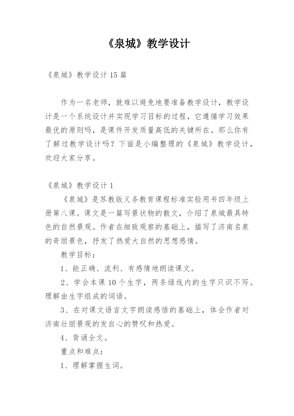 《泉城》教学设计《泉城》教学设计15篇作为一名老师,就难以避免地要准备教学设计,教学设计是一个系统设计并实现学习目标的过程,它遵循学习效果最优的原则吗,是课件开发质量高低的关键所在。那么你有了解过教学设计吗?下面是小编整理的《泉城》教学设计,欢迎大家分享。《泉城》教学设计1《泉城》是苏教版义务教育课程标准实验用书四年级上册第八课。课文是一篇写景状物的散文,介绍了泉城最具特色的自然景观。作者在细致观察的基础上,描写了济南名泉的奇丽景色,抒发了热爱大自然的思想感情。教学目标:1、能正确、流利、有感情地朗读课文