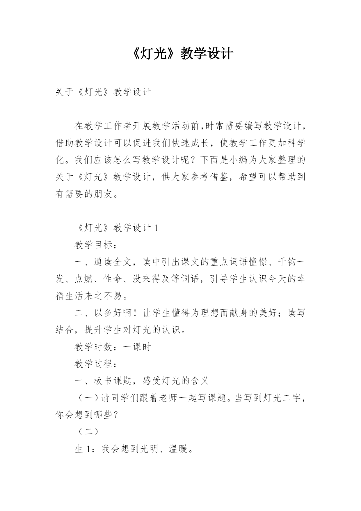 《灯光》教学设计关于《灯光》教学设计在教学工作者开展教学活动前,时常需要编写教学设计,借助教学设计可以促进我们快速成长,使教学工作更加科学化。我们应该怎么写教学设计呢?下面是小编为大家整理的关于《灯光》教学设计,供大家参考借鉴,希望可以帮助到有需要的朋友。《灯光》教学设计1教学目标:一、通读全文,读中引出课文的重点词语憧憬、千钧一发、点燃、性命、没来得及等词语,引导学生认识今天的幸福生活来之不易。二、以多好啊!让学生懂得为理想而献身的美好;读写结合,提升学生对灯光的认识。教学时数:一课时教学过程:一、板书