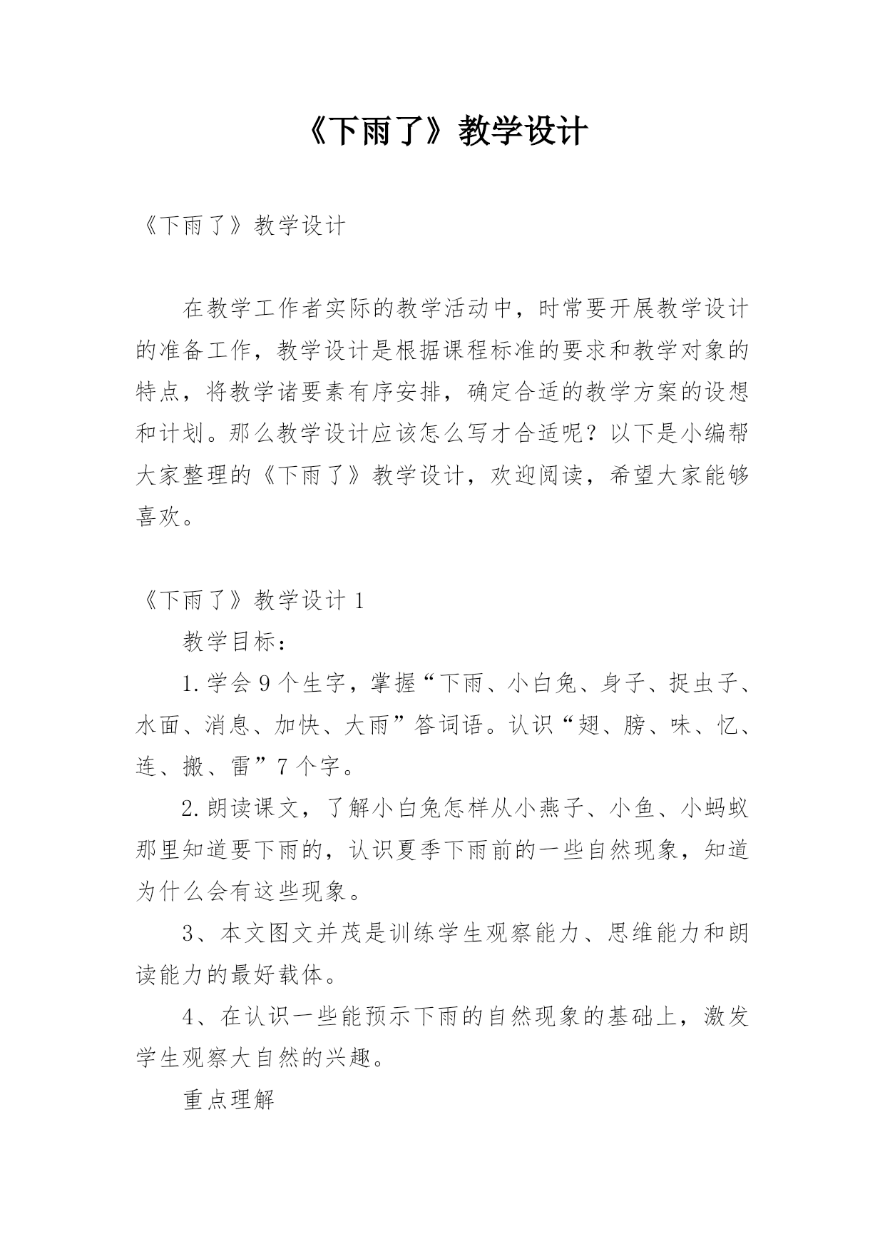 《下雨了》教学设计《下雨了》教学设计在教学工作者实际的教学活动中,时常要开展教学设计的准备工作,教学设计是根据课程标准的要求和教学对象的特点,将教学诸要素有序安排,确定合适的教学方案的设想和计划。那么教学设计应该怎么写才合适呢?以下是小编帮大家整理的《下雨了》教学设计,欢迎阅读,希望大家能够喜欢。《下雨了》教学设计1教学目标:1.学会9个生字,掌握“下雨、小白兔、身子、捉虫子、水面、消息、加快、大雨”答词语。认识“翅、膀、味、忆、连、搬、雷”7个字。2.朗读课文,了解小白兔怎样从小燕子、小鱼、小蚂蚁那里知