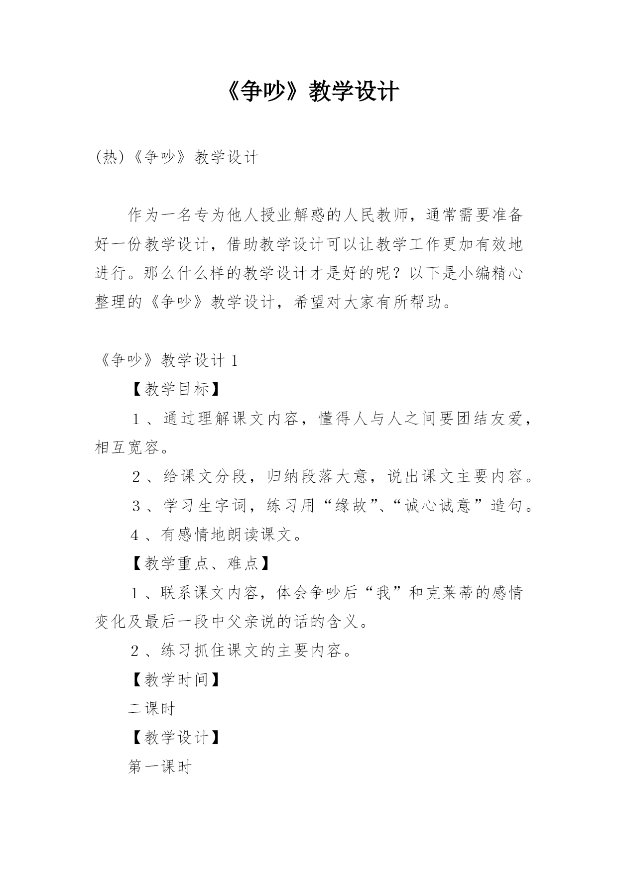 《争吵》教学设计(热)《争吵》教学设计作为一名专为他人授业解惑的人民教师,通常需要准备好一份教学设计,借助教学设计可以让教学工作更加有效地进行。那么什么样的教学设计才是好的呢?以下是小编精心整理的《争吵》教学设计,希望对大家有所帮助。《争吵》教学设计1【教学目标】1、通过理解课文内容,懂得人与人之间要团结友爱,相互宽容。2、给课文分段,归纳段落大意,说出课文主要内容。3、学习生字词,练习用“缘故”、“诚心诚意”造句。4、有感情地朗读课文。【教学重点、难点】1、联系课文内容,体会争吵后“我”和克莱蒂的感情变