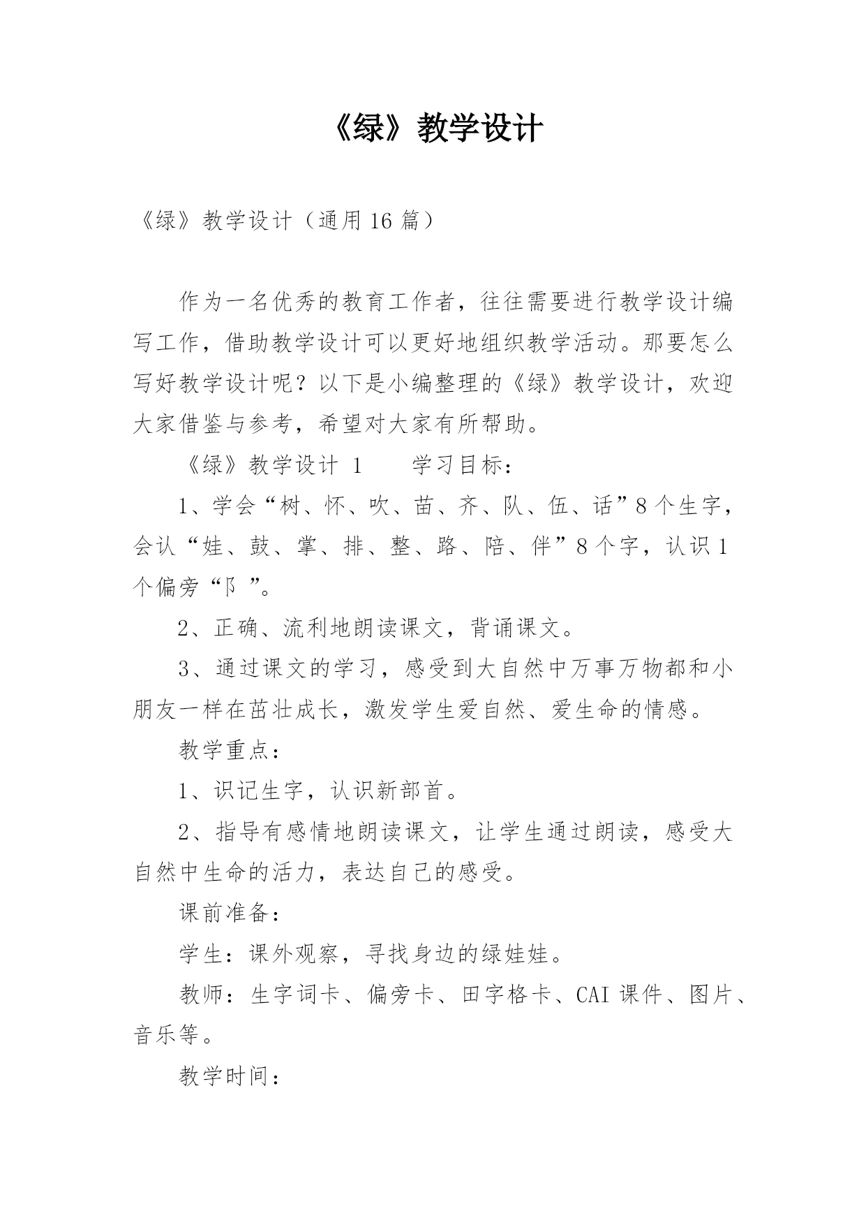 《绿》教学设计《绿》教学设计(通用16篇)作为一名优秀的教育工作者,往往需要进行教学设计编写工作,借助教学设计可以更好地组织教学活动。那要怎么写好教学设计呢?以下是小编整理的《绿》教学设计,欢迎大家借鉴与参考,希望对大家有所帮助。《绿》教学设计1学习目标:1、学会“树、怀、吹、苗、齐、队、伍、话”8个生字,会认“娃、鼓、掌、排、整、路、陪、伴”8个字,认识1个偏旁“阝”。2、正确、流利地朗读课文,背诵课文。3、通过课文的学习,感受到大自然中万事万物都和小朋友一样在茁壮成长,激发学生爱自然、爱生命的情感。教