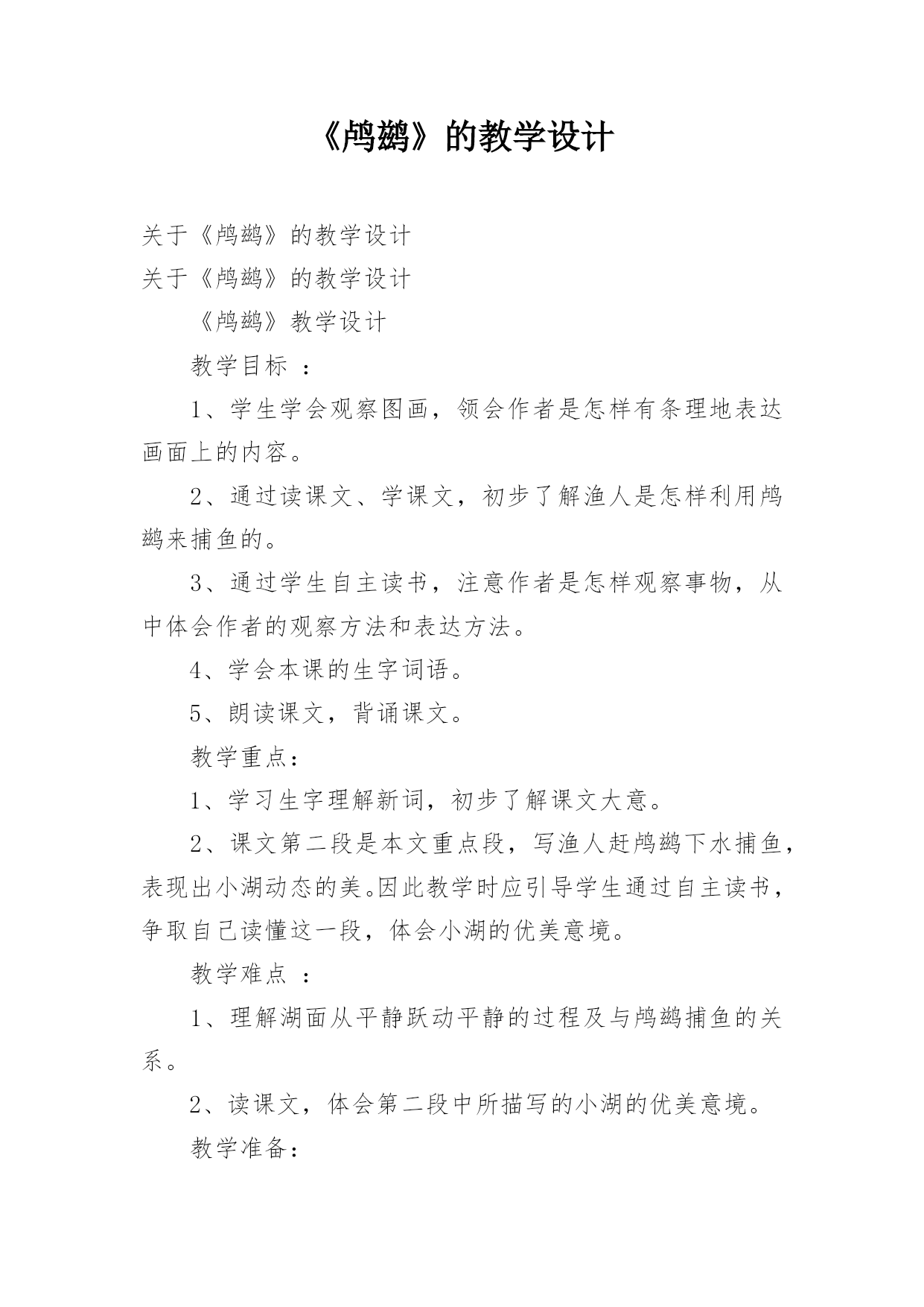 《鸬鹚》的教学设计关于《鸬鹚》的教学设计关于《鸬鹚》的教学设计《鸬鹚》教学设计教学目标:1、学生学会观察图画,领会作者是怎样有条理地表达画面上的内容。2、通过读课文、学课文,初步了解渔人是怎样利用鸬鹚来捕鱼的。3、通过学生自主读书,注意作者是怎样观察事物,从中体会作者的观察方法和表达方法。4、学会本课的生字词语。5、朗读课文,背诵课文。教学重点:1、学习生字理解新词,初步了解课文大意。2、课文第二段是本文重点段,写渔人赶鸬鹚下水捕鱼,表现出小湖动态的美。因此教学时应引导学生通过自主读书,争取自己读懂这一段