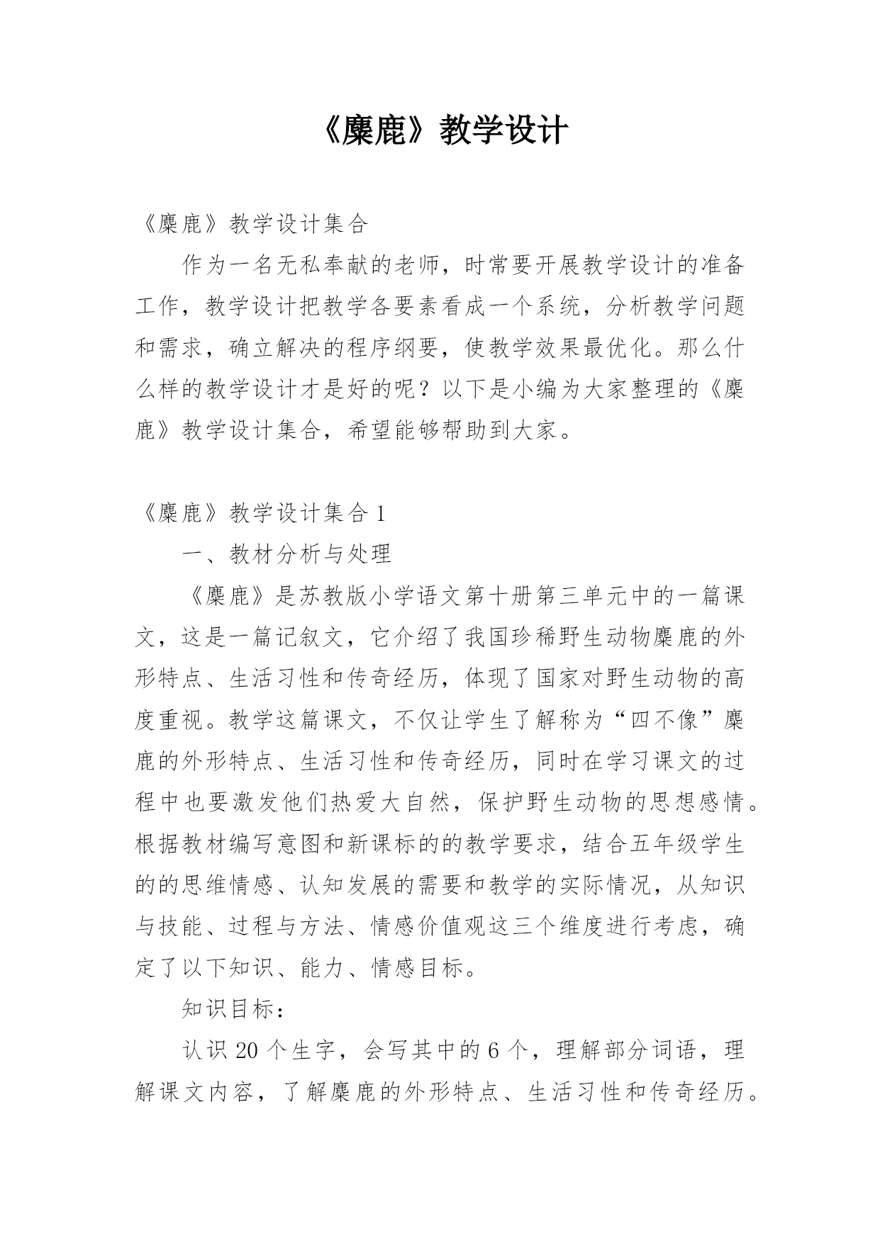 《麋鹿》教学设计《麋鹿》教学设计集合作为一名无私奉献的老师,时常要开展教学设计的准备工作,教学设计把教学各要素看成一个系统,分析教学问题和需求,确立解决的程序纲要,使教学效果最优化。那么什么样的教学设计才是好的呢?以下是小编为大家整理的《麋鹿》教学设计集合,希望能够帮助到大家。《麋鹿》教学设计集合1一、教材分析与处理《麋鹿》是苏教版小学语文第十册第三单元中的一篇课文,这是一篇记叙文,它介绍了我国珍稀野生动物麋鹿的外形特点、生活习性和传奇经历,体现了国家对野生动物的高度重视。教学这篇课文,不仅让学生了解称为