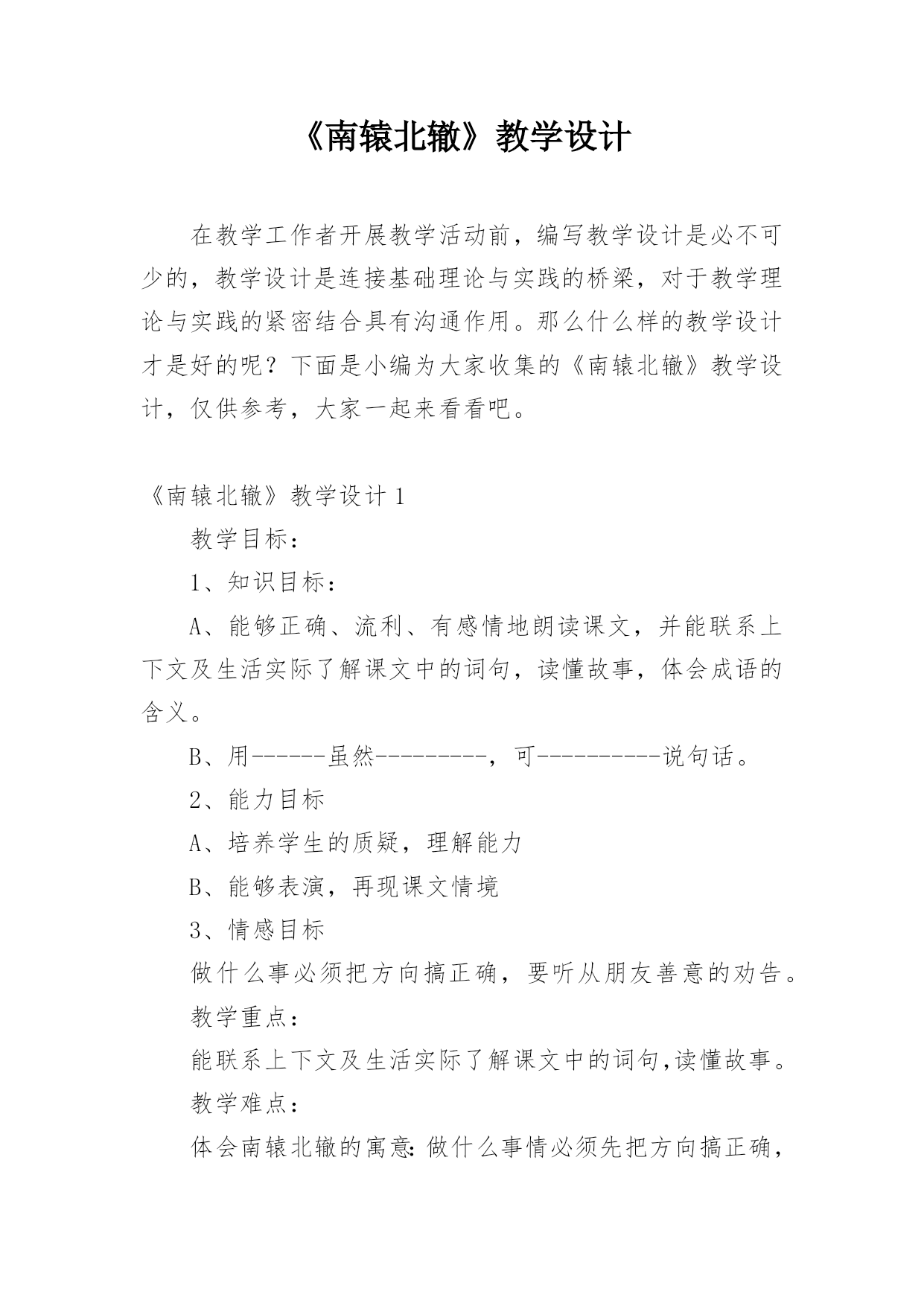 《南辕北辙》教学设计在教学工作者开展教学活动前,编写教学设计是必不可少的,教学设计是连接基础理论与实践的桥梁,对于教学理论与实践的紧密结合具有沟通作用。那么什么样的教学设计才是好的呢?下面是小编为大家收集的《南辕北辙》教学设计,仅供参考,大家一起来看看吧。《南辕北辙》教学设计1教学目标:1、知识目标:A、能够正确、流利、有感情地朗读课文,并能联系上下文及生活实际了解课文中的词句,读懂故事,体会成语的含义。B、用------虽然---------,可----------说句话。2、能力目标A、培养学生的质疑