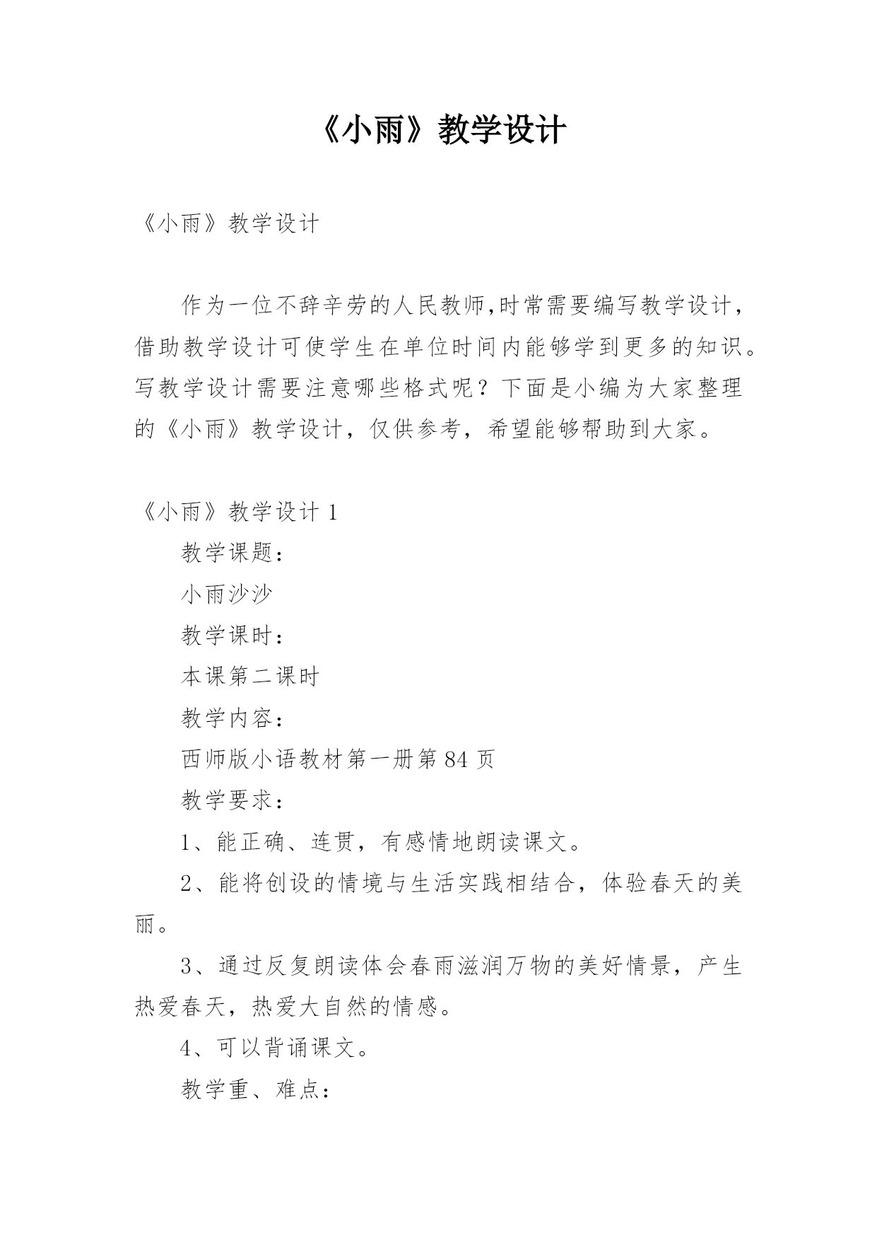 《小雨》教学设计《小雨》教学设计作为一位不辞辛劳的人民教师,时常需要编写教学设计,借助教学设计可使学生在单位时间内能够学到更多的知识。写教学设计需要注意哪些格式呢?下面是小编为大家整理的《小雨》教学设计,仅供参考,希望能够帮助到大家。《小雨》教学设计1教学课题:小雨沙沙教学课时:本课第二课时教学内容:西师版小语教材第一册教学要求:1、能正确、连贯,有感情地朗读课文。2、能将创设的情境与生活实践相结合,体验春天的美丽。3、通过反复朗读体会春雨滋润万物的美好情景,产生热爱春天,热爱大自然的情感。4、可以背诵课