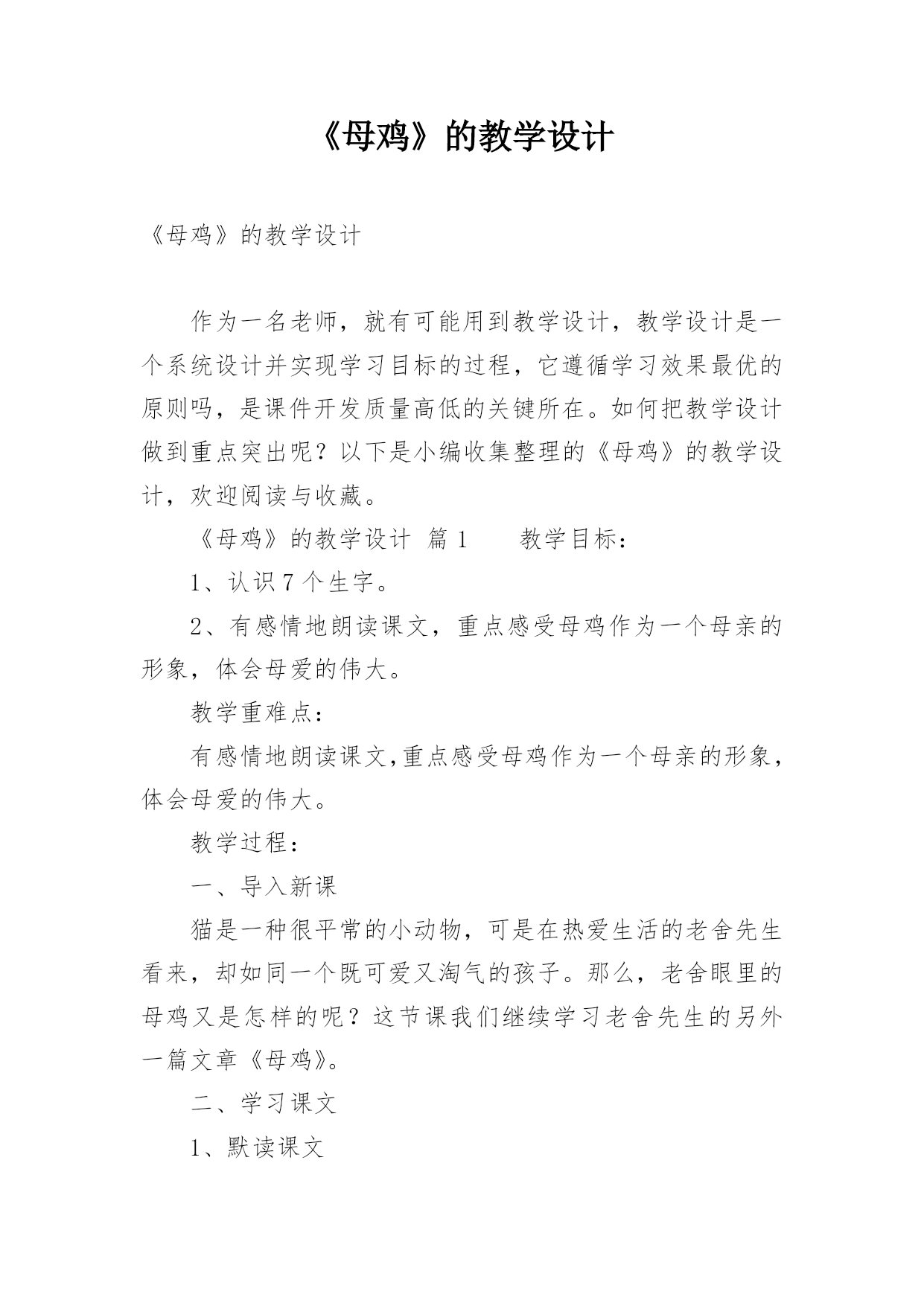 《母鸡》的教学设计《母鸡》的教学设计作为一名老师,就有可能用到教学设计,教学设计是一个系统设计并实现学习目标的过程,它遵循学习效果最优的原则吗,是课件开发质量高低的关键所在。如何把教学设计做到重点突出呢?以下是小编收集整理的《母鸡》的教学设计,欢迎阅读与收藏。《母鸡》的教学设计篇1教学目标:1、认识7个生字。2、有感情地朗读课文,重点感受母鸡作为一个母亲的形象,体会母爱的伟大。教学重难点:有感情地朗读课文,重点感受母鸡作为一个母亲的形象,体会母爱的伟大。教学过程:一、导入新课猫是一种很平常的小动物,可是在