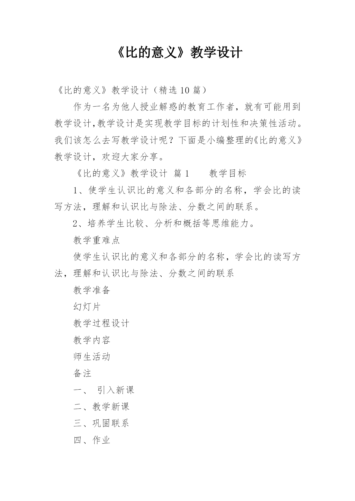 《比的意义》教学设计《比的意义》教学设计(精选10篇)作为一名为他人授业解惑的教育工作者,就有可能用到教学设计,教学设计是实现教学目标的计划性和决策性活动。我们该怎么去写教学设计呢?下面是小编整理的《比的意义》教学设计,欢迎大家分享。《比的意义》教学设计篇1教学目标1、使学生认识比的意义和各部分的名称,学会比的读写方法,理解和认识比与除法、分数之间的联系。2、培养学生比较、分析和概括等思维能力。教学重难点使学生认识比的意义和各部分的名称,学会比的读写方法,理解和认识比与除法、分数之间的联系教学准备幻灯片教
