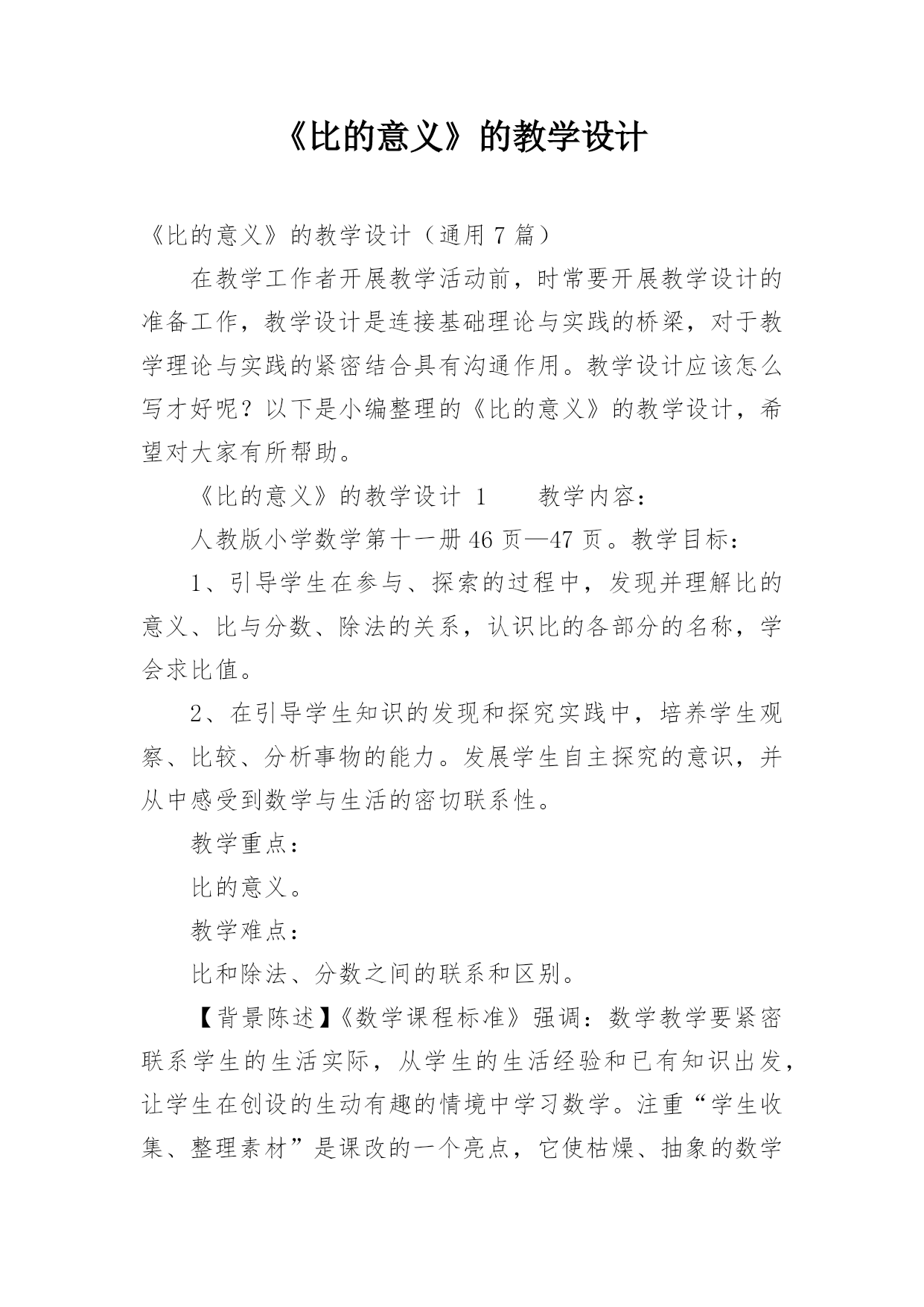 《比的意义》的教学设计《比的意义》的教学设计(通用7篇)在教学工作者开展教学活动前,时常要开展教学设计的准备工作,教学设计是连接基础理论与实践的桥梁,对于教学理论与实践的紧密结合具有沟通作用。教学设计应该怎么写才好呢?以下是小编整理的《比的意义》的教学设计,希望对大家有所帮助。《比的意义》的教学设计1教学内容:人教版小学数学第十一册46页—47页。教学目标:1、引导学生在参与、探索的过程中,发现并理解比的意义、比与分数、除法的关系,认识比的各部分的名称,学会求比值。2、在引导学生知识的发现和探究实践中,培