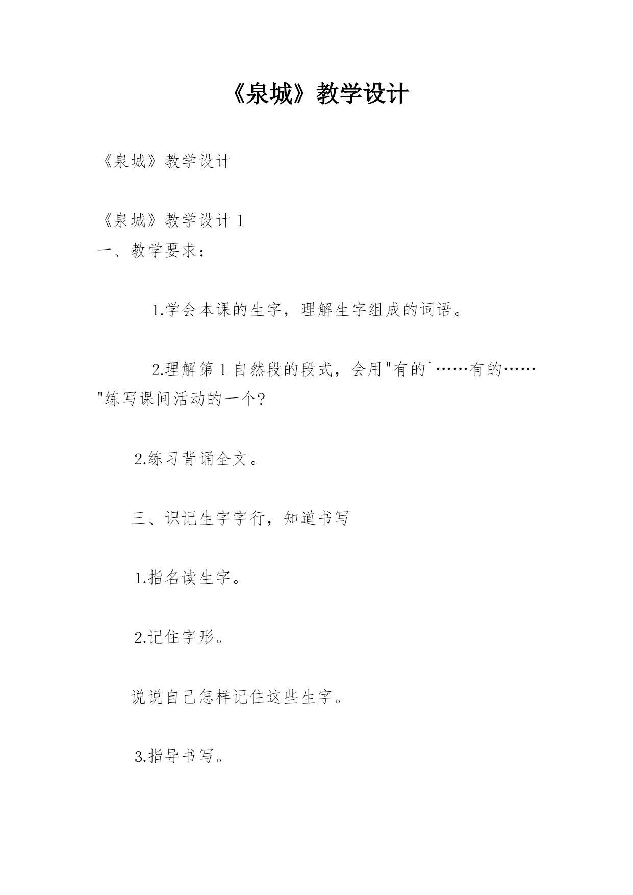 《泉城》教学设计《泉城》教学设计《泉城》教学设计1一、教学要求:⒈学会本课的生字,理解生字组成的词语。⒉理解第1自然段的段式,会用"有的`……有的……"练写课间活动的一个?⒉练习背诵全文。三、识记生字字行,知道书写⒈指名读生字。⒉记住字形。说说自己怎样记住这些生字。⒊指导书写。四、作业1.抄写生字⒉抄写词语。⒊组词。⒋背诵全文。---------------------------《泉城》教学设计2教学要求:⒈学会本课的生字,理解生字组成的词语。⒉理解第1自然段的段式,会用有的……有的……练写课间活动的一
