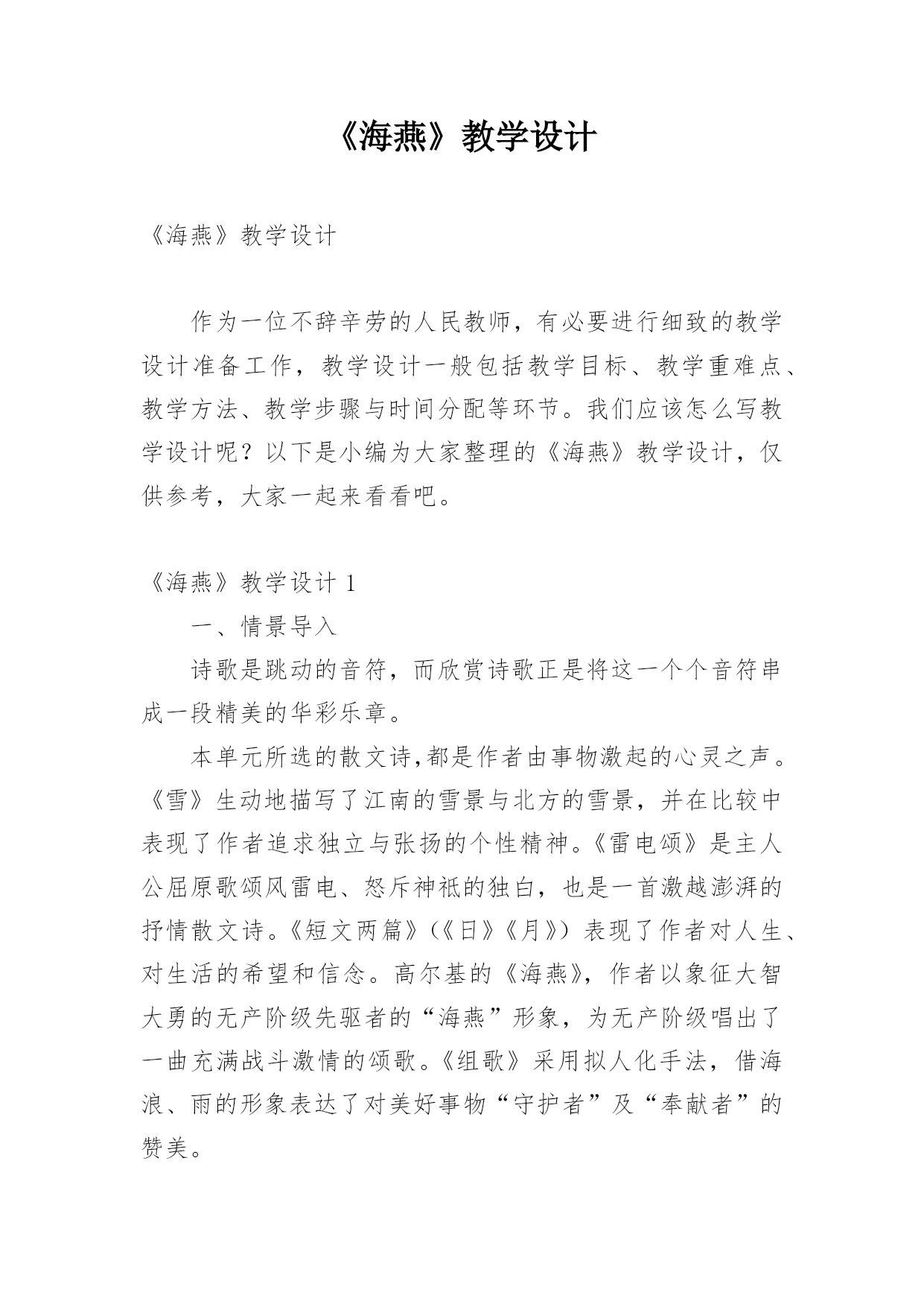 《海燕》教学设计《海燕》教学设计作为一位不辞辛劳的人民教师,有必要进行细致的教学设计准备工作,教学设计一般包括教学目标、教学重难点、教学方法、教学步骤与时间分配等环节。我们应该怎么写教学设计呢?以下是小编为大家整理的《海燕》教学设计,仅供参考,大家一起来看看吧。《海燕》教学设计1一、情景导入诗歌是跳动的音符,而欣赏诗歌正是将这一个个音符串成一段精美的华彩乐章。本单元所选的散文诗,都是作者由事物激起的心灵之声。《雪》生动地描写了江南的雪景与北方的雪景,并在比较中表现了作者追求独立与张扬的个性精神。《雷电颂》