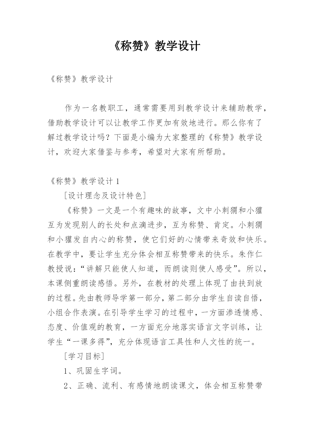《称赞》教学设计《称赞》教学设计作为一名教职工,通常需要用到教学设计来辅助教学,借助教学设计可以让教学工作更加有效地进行。那么你有了解过教学设计吗?下面是小编为大家整理的《称赞》教学设计,欢迎大家借鉴与参考,希望对大家有所帮助。《称赞》教学设计1[设计理念及设计特色]《称赞》一文是一个有趣味的故事,文中小刺猬和小獾互为发现别人的长处和点滴进步,互为称赞、肯定。小刺猬和小獾发自内心的称赞,使它们好的心情带来奇效和快乐。在教学中,要让学生充分体会相互称赞带来的快乐。朱作仁教授说:“讲解只能使人知道,而朗读则使