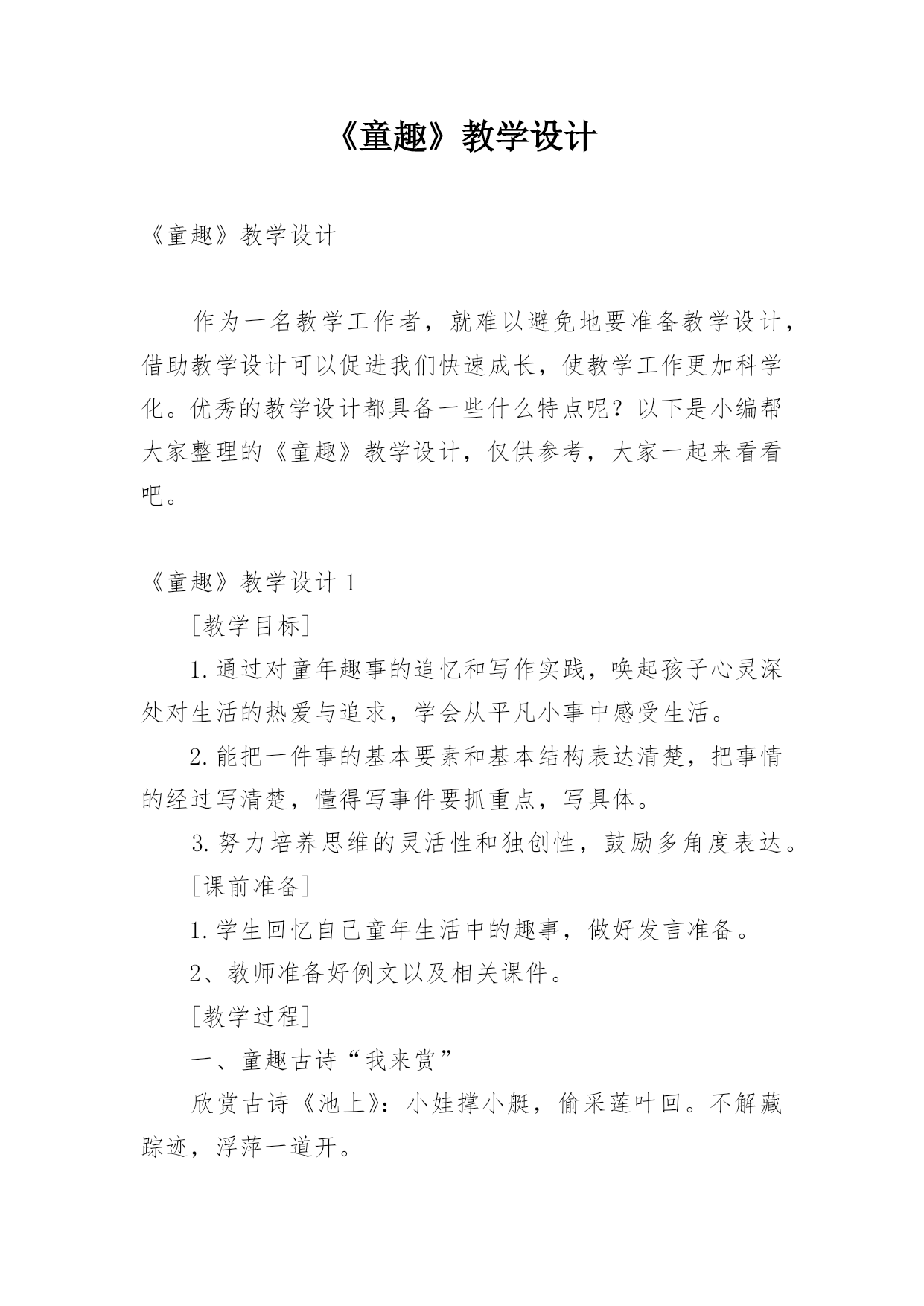 《童趣》教学设计《童趣》教学设计作为一名教学工作者,就难以避免地要准备教学设计,借助教学设计可以促进我们快速成长,使教学工作更加科学化。优秀的教学设计都具备一些什么特点呢?以下是小编帮大家整理的《童趣》教学设计,仅供参考,大家一起来看看吧。《童趣》教学设计1[教学目标]1.通过对童年趣事的追忆和写作实践,唤起孩子心灵深处对生活的热爱与追求,学会从平凡小事中感受生活。2.能把一件事的基本要素和基本结构表达清楚,把事情的经过写清楚,懂得写事件要抓重点,写具体。3.努力培养思维的灵活性和独创性,鼓励多角度表达。