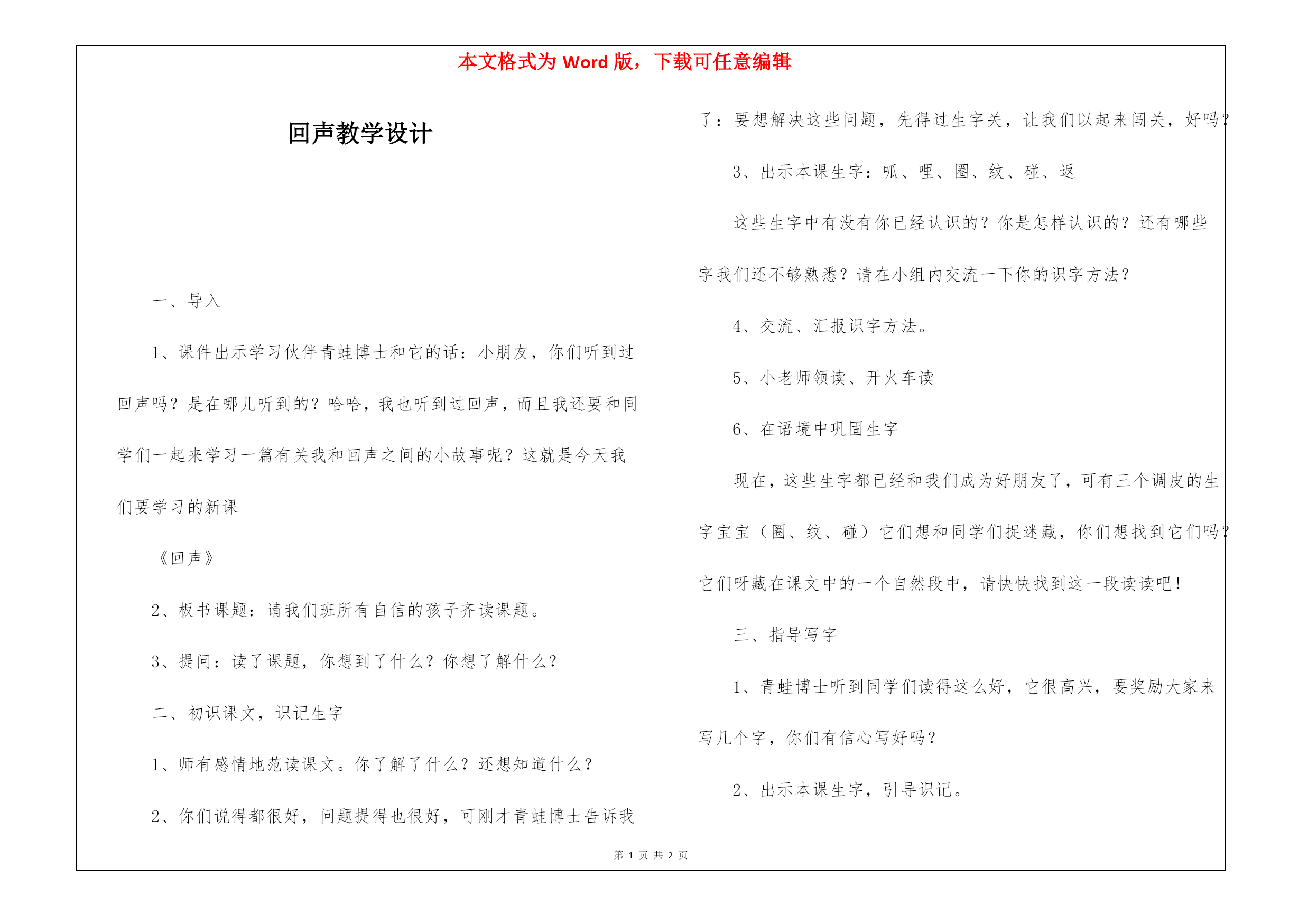 本文格式为Word版,下载可任意编辑第PAGE\*MERGEFORMAT2页共NUMPAGES\*MERGEFORMAT2页回声教学设计一、导入1、课件出示学习伙伴青蛙博士和它的话:小朋友,你们听到过回声吗?是在哪儿听到的?哈哈,我也听到过回声,而且我还要和同学们一起来学习一篇有关我和回声之间的小故事呢?这就是今天我们要学习的新课《回声》2、板书课题:请我们班所有自信的孩子齐读课题。3、提问:读了课题,你想到了什么?你想了解什么?二、初识课文,识记生字1、师有感情地范读课文。你了解了什么?还想