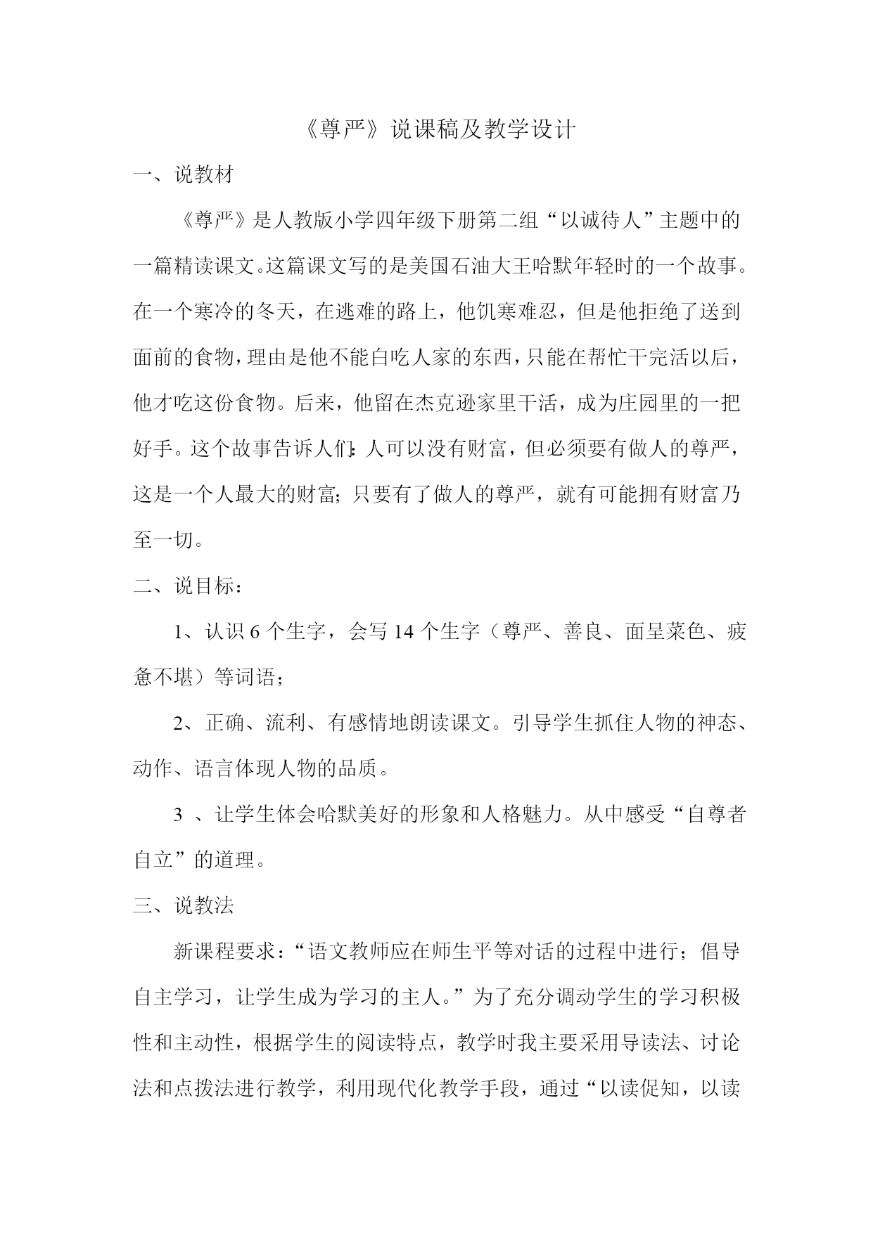 《尊严》说课稿及教学设计一、说教材《尊严》是人教版小学四年级下册第二组“以诚待人”主题中的一篇精读课文。这篇课文写的是美国石油大王哈默年轻时的一个故事。在一个寒冷的冬天,在逃难的路上,他饥寒难忍,但是他拒绝了送到面前的食物,理由是他不能白吃人家的东西,只能在帮忙干完活以后,他才吃这份食物。后来,他留在杰克逊家里干活,成为庄园里的一把好手。这个故事告诉人们:人可以没有财富,但必须要有做人的尊严,这是一个人最大的财富;只要有了做人的尊严,就有可能拥有财富乃至一切。二、说目标:1、认识6个生字,会写14个生字(