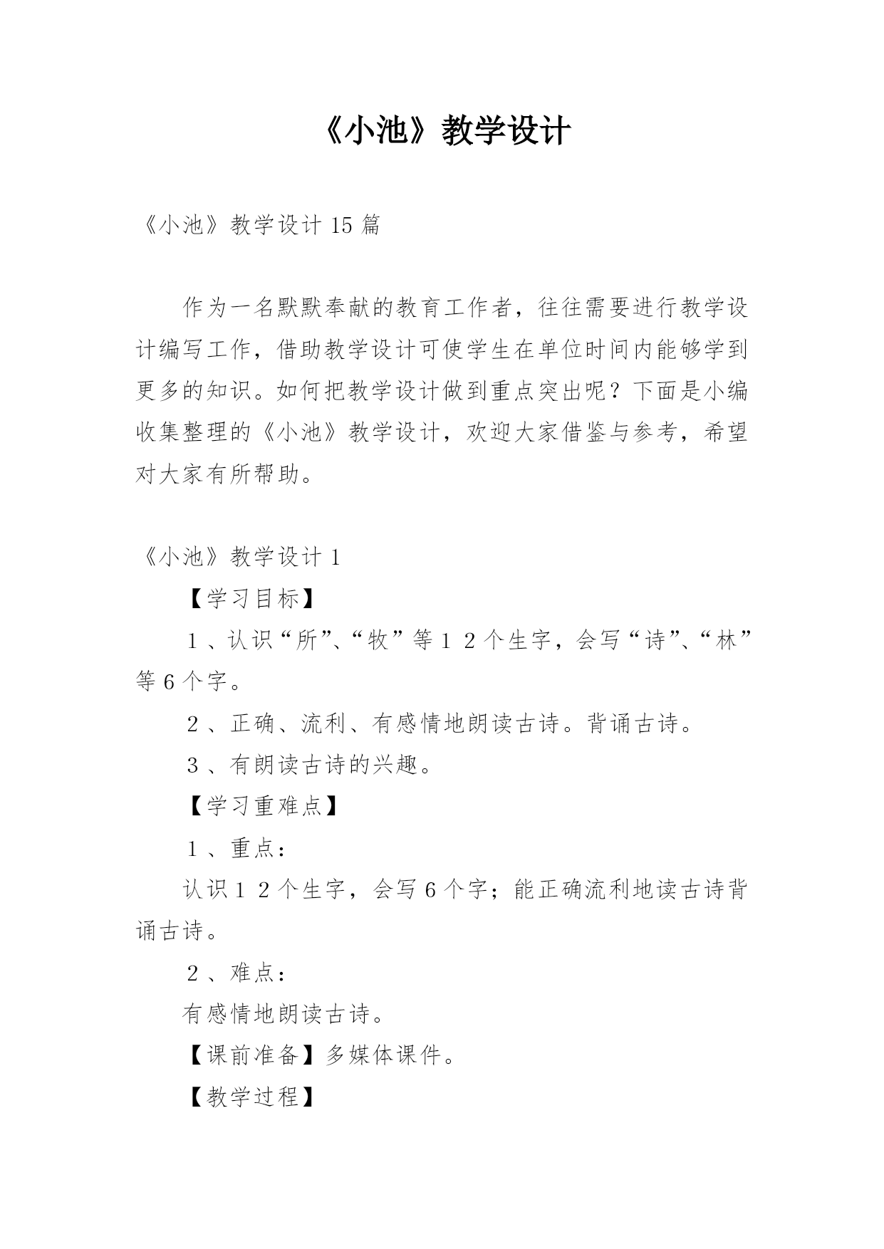 《小池》教学设计《小池》教学设计15篇作为一名默默奉献的教育工作者,往往需要进行教学设计编写工作,借助教学设计可使学生在单位时间内能够学到更多的知识。如何把教学设计做到重点突出呢?下面是小编收集整理的《小池》教学设计,欢迎大家借鉴与参考,希望对大家有所帮助。《小池》教学设计1【学习目标】1、认识“所”、“牧”等12个生字,会写“诗”、“林”等6个字。2、正确、流利、有感情地朗读古诗。背诵古诗。3、有朗读古诗的兴趣。【学习重难点】1、重点:认识12个生字,会写6个字;能正确流利地读古诗背诵古诗。2、难点:有