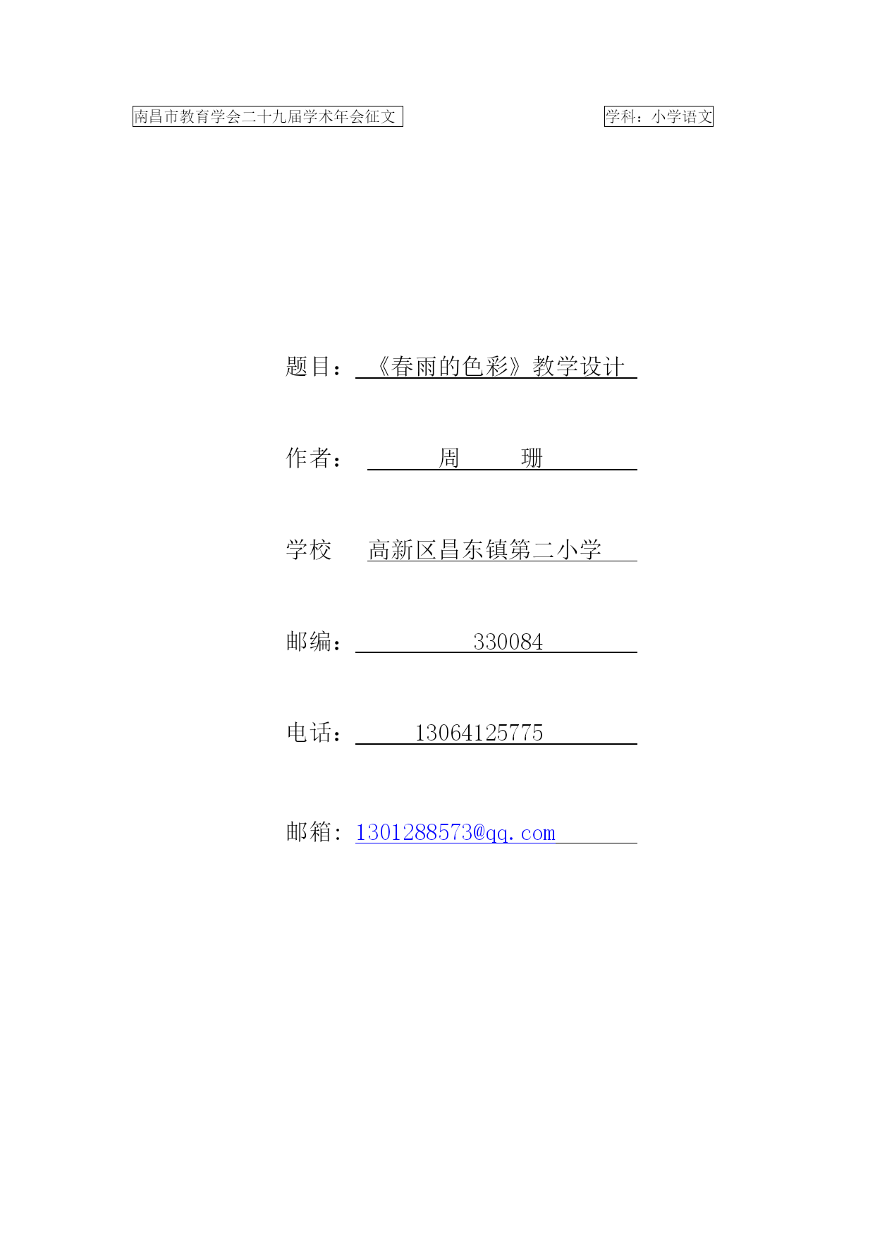 南昌市教育学会二十九届学术年会征文学科:小学语文题目:《春雨的色彩》教学设计作者:周珊学校高新区昌东镇第二小学邮编:330084电话:13064125775邮箱:HYPERLINK"mailto:1301288573@qq.com"1301288573@qq.com《春雨的色彩》教学设计第一课时一、教学内容人教版一年级下册第二课《春雨的色彩》第一课时。认识11个生字,会写6个生字,初步理解课文内容,培养学生有主动积累词语的意识,逐渐养成积累的习惯。二、教材分析《春雨的色彩》是一个童话故事,它通过一群
