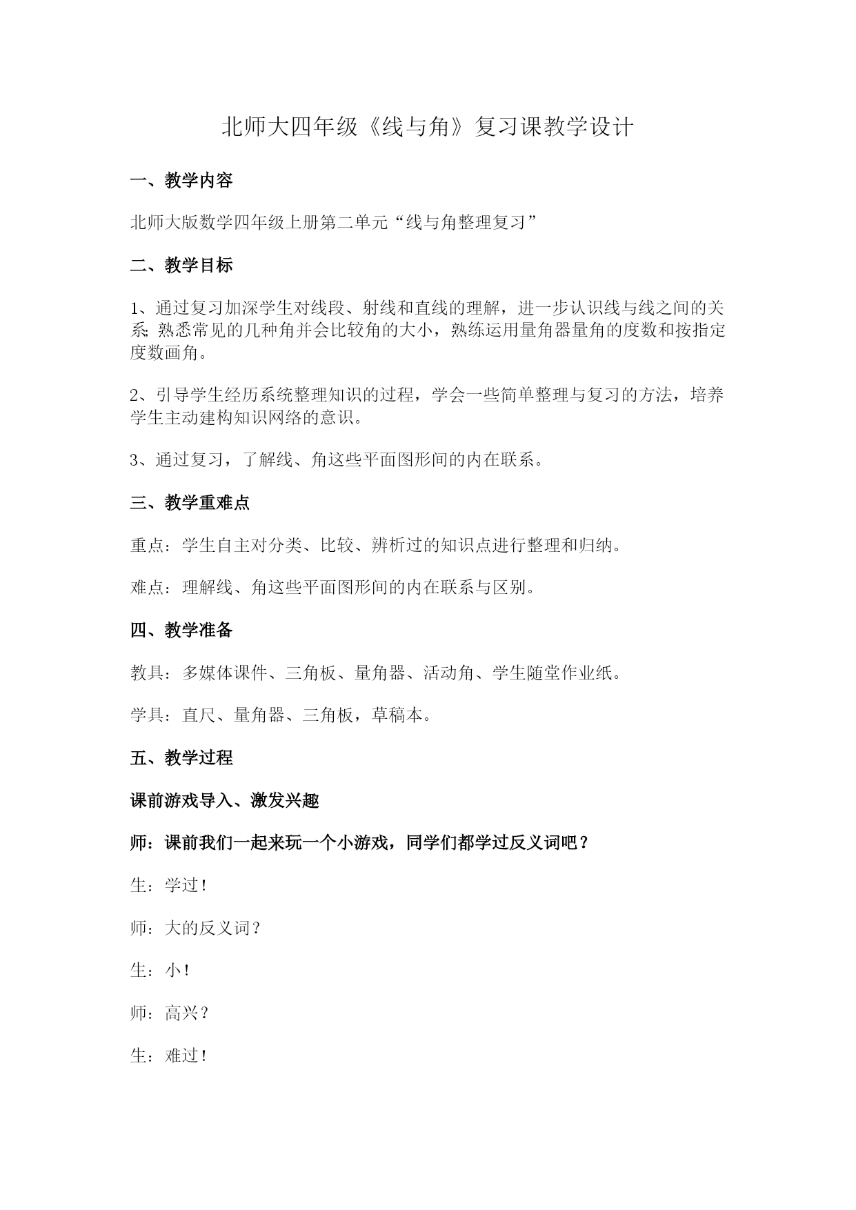 北师大四年级《线与角》复习课教学设计一、教学内容北师大版数学四年级上册第二单元“线与角整理复习”二、教学目标1、通过复习加深学生对线段、射线和直线的理解,进一步认识线与线之间的关系;熟悉常见的几种角并会比较角的大小,熟练运用量角器量角的度数和按指定度数画角。2、引导学生经历系统整理知识的过程,学会一些简单整理与复习的方法,培养学生主动建构知识网络的意识。3、通过复习,了解线、角这些平面图形间的内在联系。三、教学重难点重点:学生自主对分类、比较、辨析过的知识点进行整理和归纳。难点:理解线、角这些平面图形间的