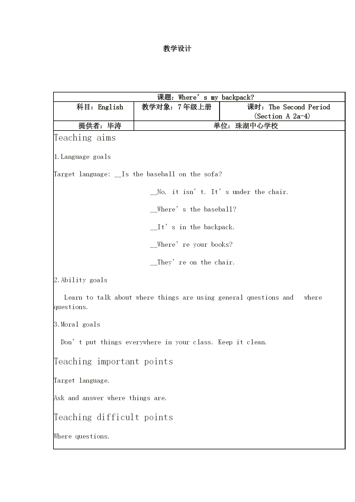 教学设计课题:Where’smybackpack?科目:English教学对象:7年级上册课时:TheSecondPeriod(SectionA2a-4)提供者:毕涛单位:珠湖中心学校Teachingaims1.LanguagegoalsTargetlanguage:__Isthebaseballonthesofa?__No,itisn’t.It’sunderthechair.__Where’sthebaseball?__It’sinthebackpack.__Where’reyourbooks?__Th