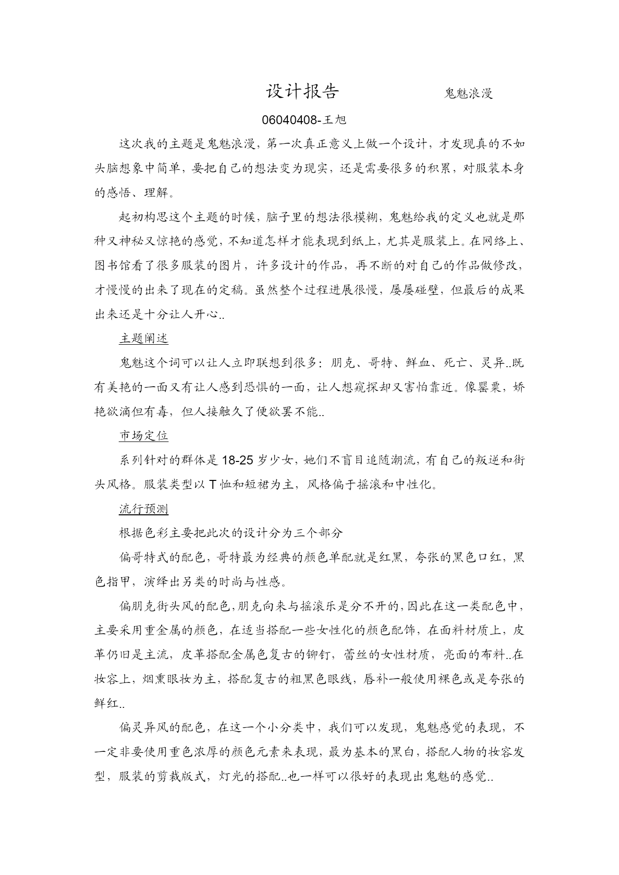 设计报告鬼魅浪漫06040408-王旭这次我的主题是鬼魅浪漫,第一次真正意义上做一个设计,才发现真的不如头脑想象中简单,要把自己的想法变为现实,还是需要很多的积累,对服装本身的感悟、理解。起初构思这个主题的时候,脑子里的想法很模糊,鬼魅给我的定义也就是那种又神秘又惊艳的感觉,不知道怎样才能表现到纸上,尤其是服装上。在网络上、图书馆看了很多服装的图片,许多设计的作品,再不断的对自己的作品做修改,才慢慢的出来了现在的定稿。虽然整个过程进展很慢,屡屡碰壁,但最后的成果出来还是十分让人开心..主题阐述鬼魅这个词可