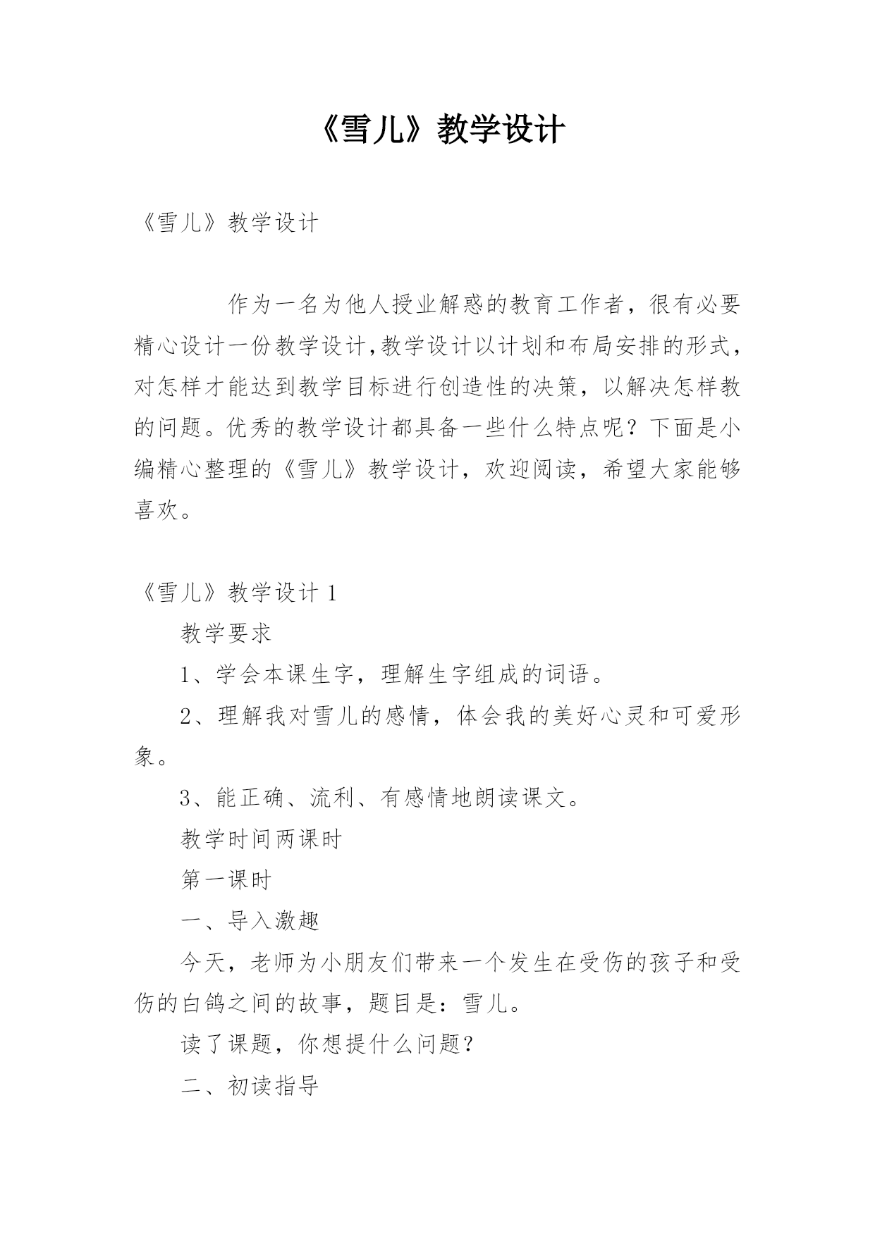 《雪儿》教学设计《雪儿》教学设计作为一名为他人授业解惑的教育工作者,很有必要精心设计一份教学设计,教学设计以计划和布局安排的形式,对怎样才能达到教学目标进行创造性的决策,以解决怎样教的问题。优秀的教学设计都具备一些什么特点呢?下面是小编精心整理的《雪儿》教学设计,欢迎阅读,希望大家能够喜欢。《雪儿》教学设计1教学要求1、学会本课生字,理解生字组成的词语。2、理解我对雪儿的感情,体会我的美好心灵和可爱形象。3、能正确、流利、有感情地朗读课文。教学时间两课时第一课时一、导入激趣今天,老师为小朋友们带来一个发生