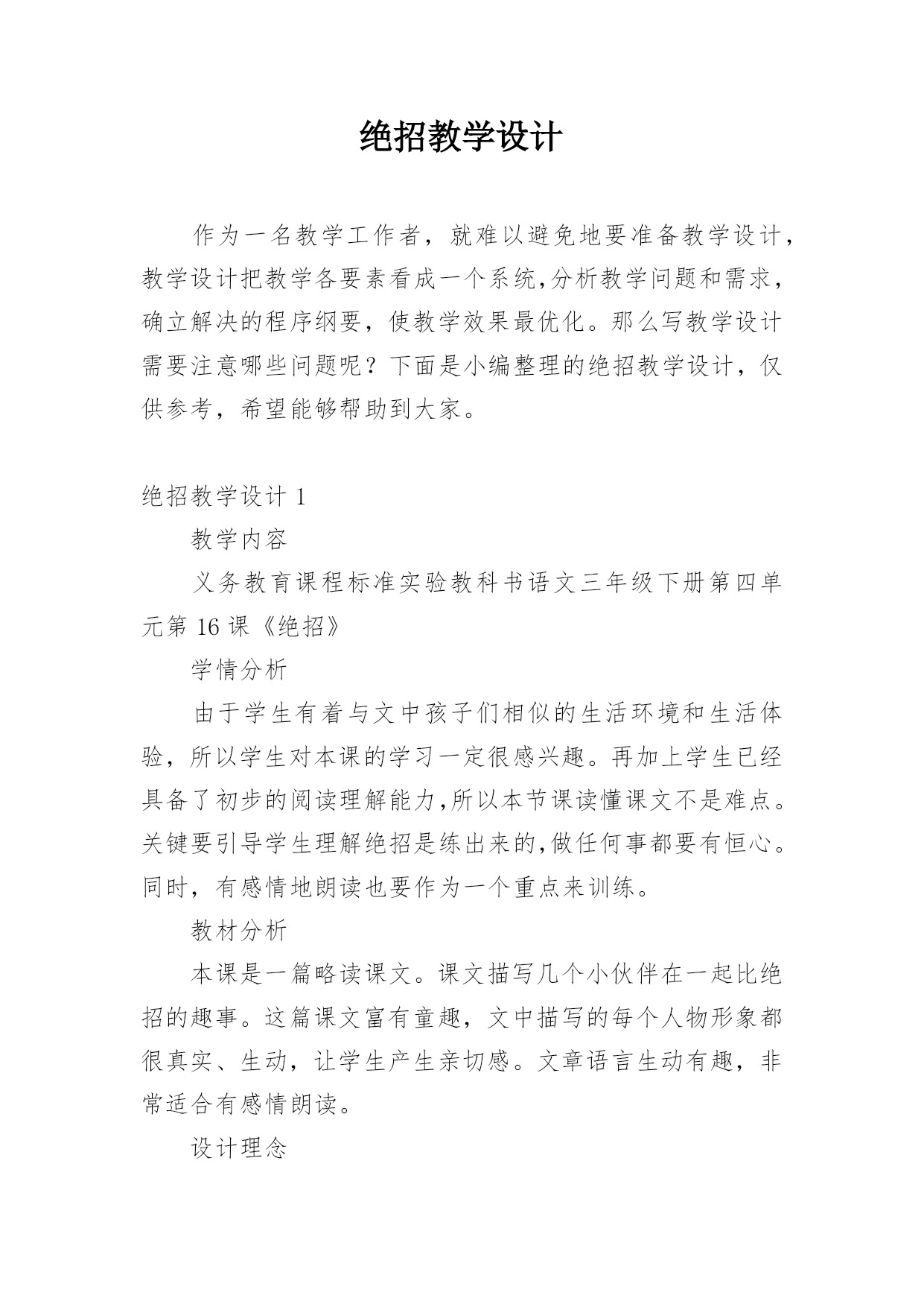 绝招教学设计作为一名教学工作者,就难以避免地要准备教学设计,教学设计把教学各要素看成一个系统,分析教学问题和需求,确立解决的程序纲要,使教学效果最优化。那么写教学设计需要注意哪些问题呢?下面是小编整理的绝招教学设计,仅供参考,希望能够帮助到大家。绝招教学设计1教学内容义务教育课程标准实验教科书语文三年级下册第四单元第16课《绝招》学情分析由于学生有着与文中孩子们相似的生活环境和生活体验,所以学生对本课的学习一定很感兴趣。再加上学生已经具备了初步的阅读理解能力,所以本节课读懂课文不是难点。关键要引导学生理解