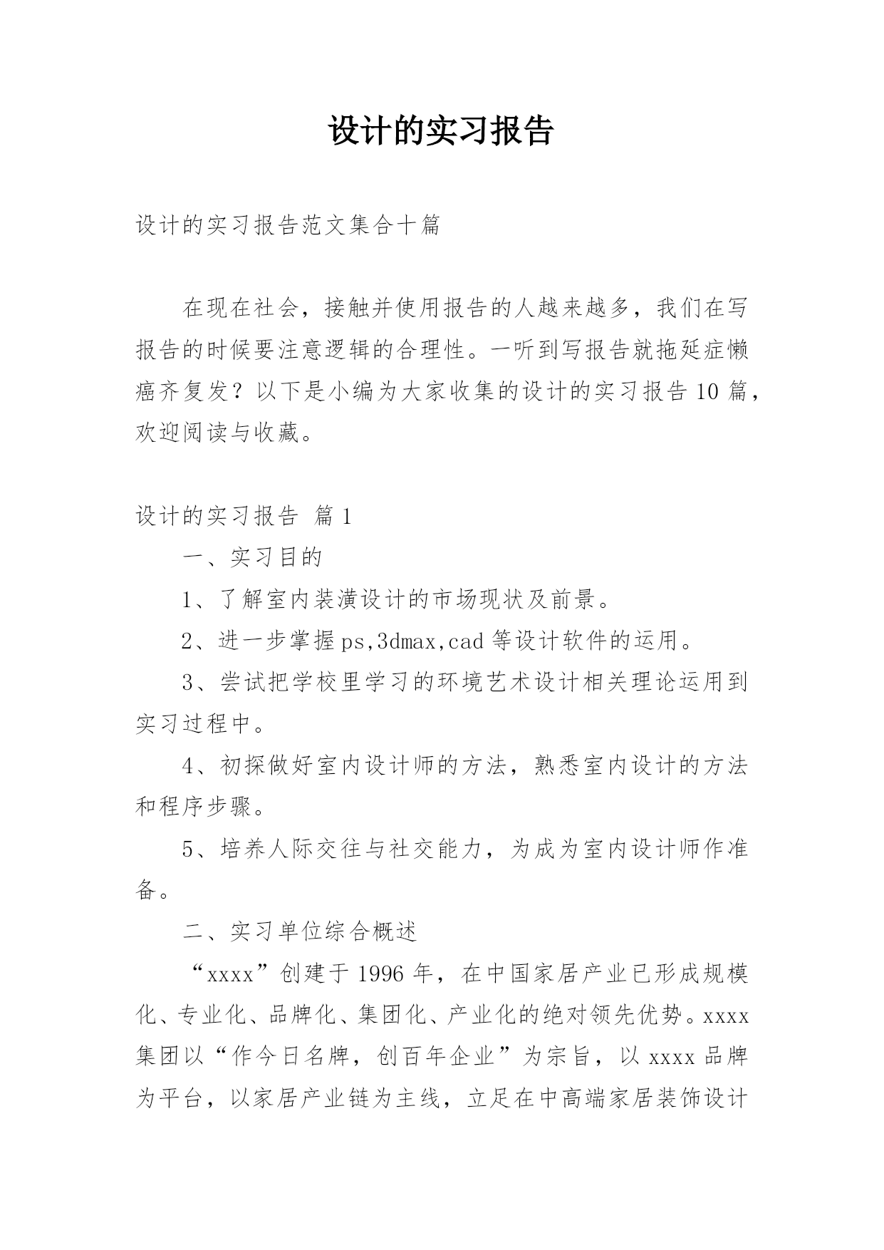 设计的实习报告设计的实习报告范文集合十篇在现在社会,接触并使用报告的人越来越多,我们在写报告的时候要注意逻辑的合理性。一听到写报告就拖延症懒癌齐复发?以下是小编为大家收集的设计的实习报告10篇,欢迎阅读与收藏。设计的实习报告篇1一、实习目的1、了解室内装潢设计的市场现状及前景。2、进一步掌握ps,3dmax,cad等设计软件的运用。3、尝试把学校里学习的环境艺术设计相关理论运用到实习过程中。4、初探做好室内设计师的方法,熟悉室内设计的方法和程序步骤。5、培养人际交往与社交能力,为成为室内设计师作准备。二、