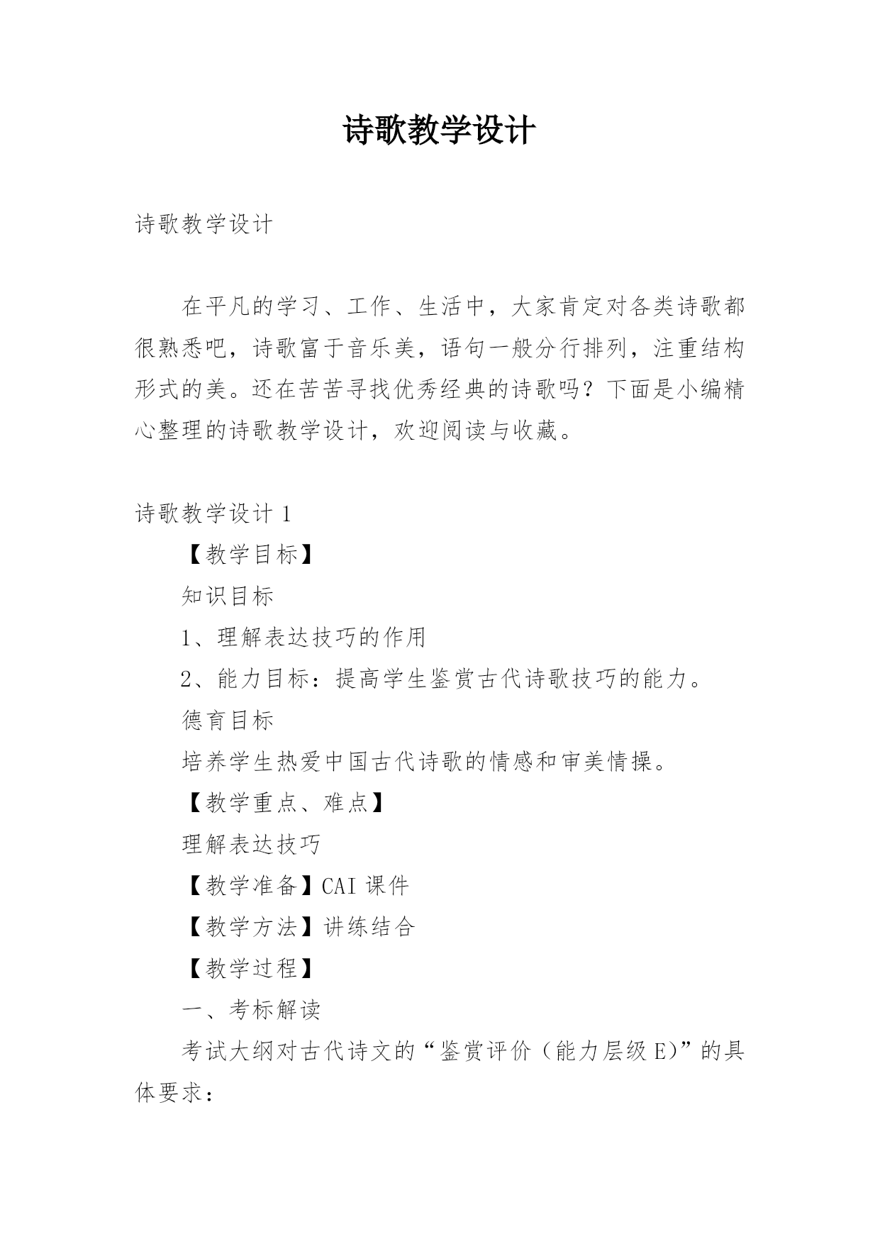 诗歌教学设计诗歌教学设计在平凡的学习、工作、生活中,大家肯定对各类诗歌都很熟悉吧,诗歌富于音乐美,语句一般分行排列,注重结构形式的美。还在苦苦寻找优秀经典的诗歌吗?下面是小编精心整理的诗歌教学设计,欢迎阅读与收藏。诗歌教学设计1【教学目标】知识目标1、理解表达技巧的作用2、能力目标:提高学生鉴赏古代诗歌技巧的能力。德育目标培养学生热爱中国古代诗歌的情感和审美情操。【教学重点、难点】理解表达技巧【教学准备】CAI课件【教学方法】讲练结合【教学过程】一、考标解读考试大纲对古代诗文的“鉴赏评价(能力层级E)”的