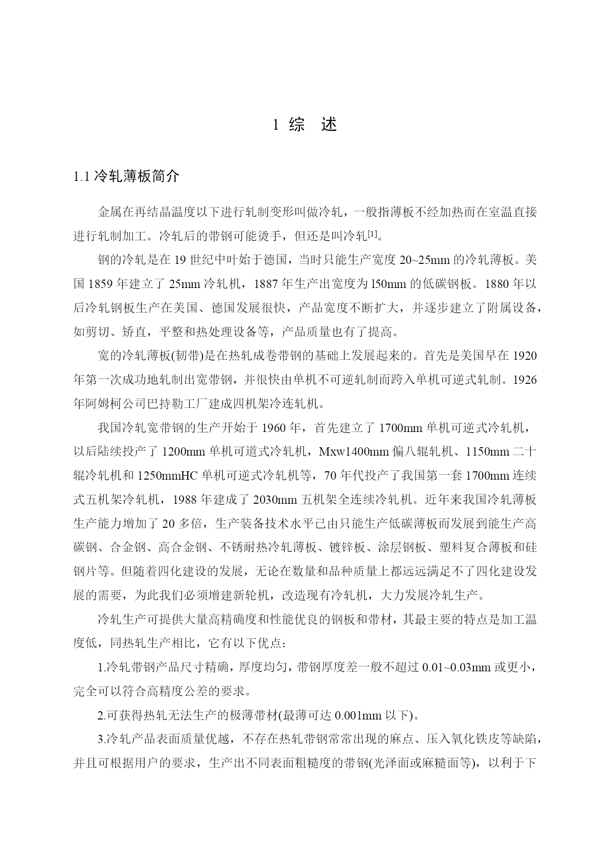 编号:时间:2021年x月x日书山有路勤为径,学海无涯苦作舟页码:第PAGEXXXVIII页共NUMPAGES39页第PAGE\*MERGEFORMATXXXVIII页共NUMPAGES\*MERGEFORMAT39页1综述1.1冷轧薄板简介金属在再结晶温度以下进行轧制变形叫做冷轧,一般指薄板不经加热而在室温直接进行轧制加工。冷轧后的带钢可能烫手,但还是叫冷轧[1]。钢的冷轧是在19世纪中叶始于德国,当时只能生产宽度20~25mm的冷轧薄板。美国1859年建立了25mm冷轧机,18