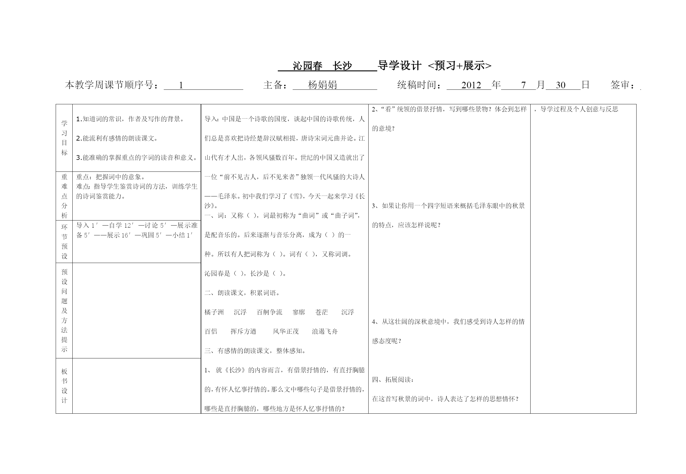 沁园春长沙导学设计<预习+展示>本教学周课节顺序号:1主备:杨娟娟统稿时间:2012年7月30日签审:学习目标1.知道词的常识,作者及写作的背景。2.能流利有感情的朗读课文。3.能准确的掌握重点的字词的读音和意义。导入:中国是一个诗歌的国度,谈起中国的诗歌传统,人们总是喜欢把诗经楚辞汉赋相提,唐诗宋词元曲并论。江山代有才人出,各领风骚数百年。世纪的中国又造就出了一位“前不见古人,后不见来者”独领一代风骚的大诗人——毛泽东。初中我们学习了《雪》,今天一起来学习《长沙》。词:又称(),词最初称为“曲词”或“曲