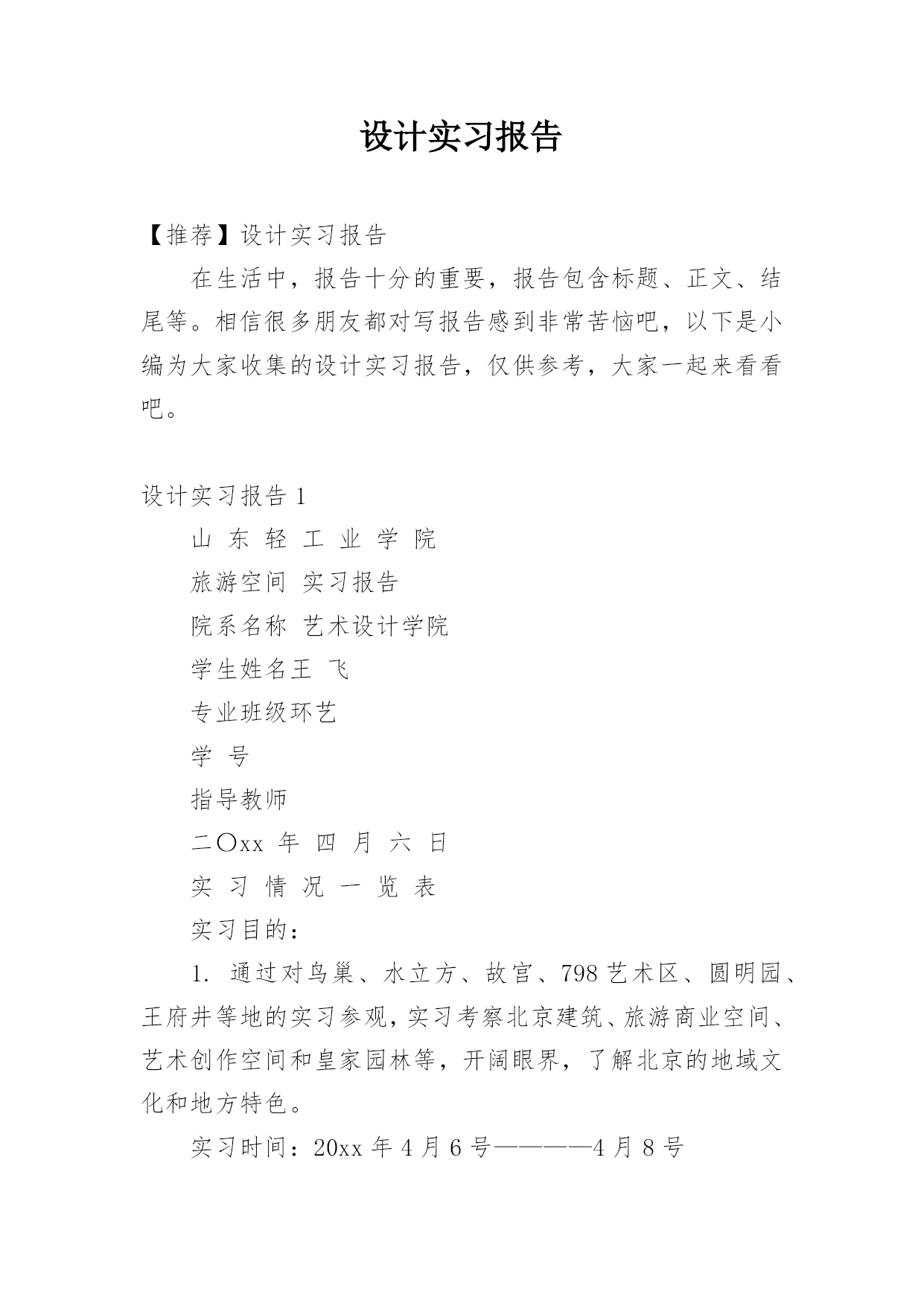 设计实习报告【推荐】设计实习报告在生活中,报告十分的重要,报告包含标题、正文、结尾等。相信很多朋友都对写报告感到非常苦恼吧,以下是小编为大家收集的设计实习报告,仅供参考,大家一起来看看吧。设计实习报告1山东轻工业学院旅游空间实习报告院系名称艺术设计学院学生姓名王飞专业班级环艺学号指导教师二〇xx年四月六日实习情况一览表实习目的:1.通过对鸟巢、水立方、故宫、798艺术区、圆明园、王府井等地的实习参观,实习考察北京建筑、旅游商业空间、艺术创作空间和皇家园林等,开阔眼界,了解北京的地域文化和地方特色。实习时间