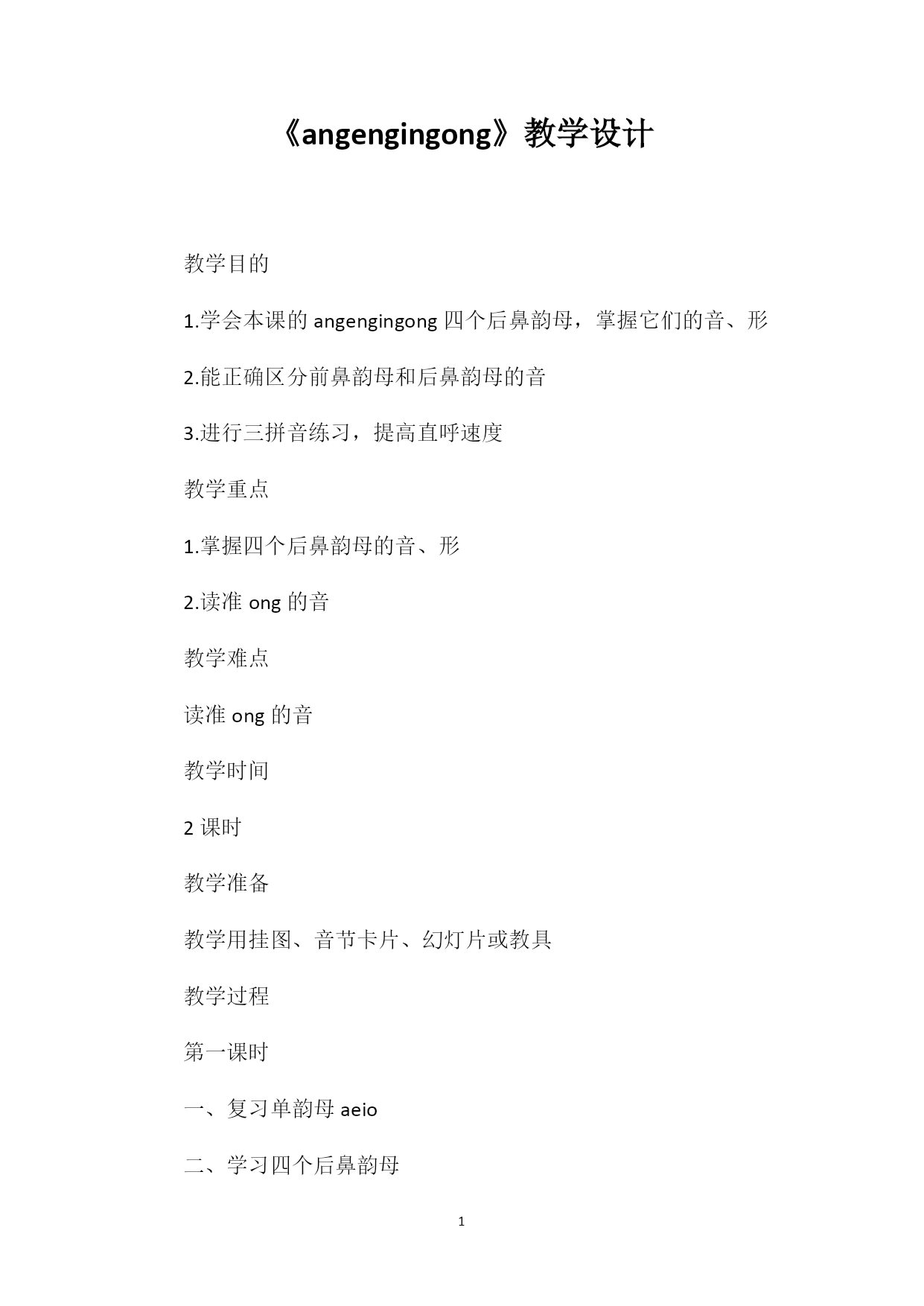 PAGEPAGE4《angengingong》教学设计教学目的1.学会本课的angengingong四个后鼻韵母,掌握它们的音、形2.能正确区分前鼻韵母和后鼻韵母的音3.进行三拼音练习,提高直呼速度教学重点1.掌握四个后鼻韵母的音、形2.读准ong的音教学难点读准ong的音教学时间2课时教学准备教学用挂图、音节卡片、幻灯片或教具教学过程第一课时一、复习单韵母aeio二、学习四个后鼻韵母教师在每个单韵母的后面加上一个ng使之成为angengingong讲:ng发鼻尾音,把舌根高抬起,嘴微开舌头往