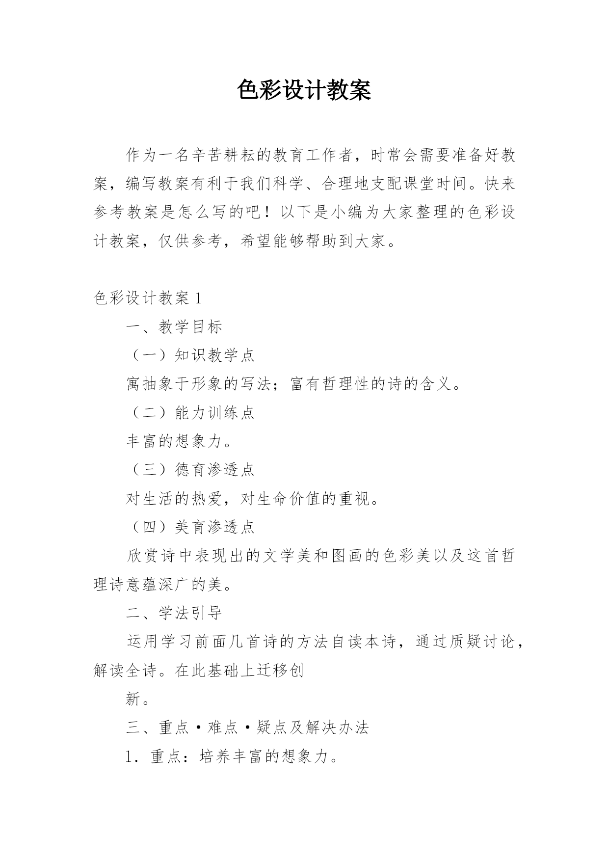色彩设计教案作为一名辛苦耕耘的教育工作者,时常会需要准备好教案,编写教案有利于我们科学、合理地支配课堂时间。快来参考教案是怎么写的吧!以下是小编为大家整理的色彩设计教案,仅供参考,希望能够帮助到大家。色彩设计教案1一、教学目标(一)知识教学点寓抽象于形象的写法;富有哲理性的诗的含义。(二)能力训练点丰富的想象力。(三)德育渗透点对生活的热爱,对生命价值的重视。(四)美育渗透点欣赏诗中表现出的文学美和图画的色彩美以及这首哲理诗意蕴深广的美。二、学法引导运用学习前面几首诗的方法自读本诗,通过质疑讨论,解读全诗